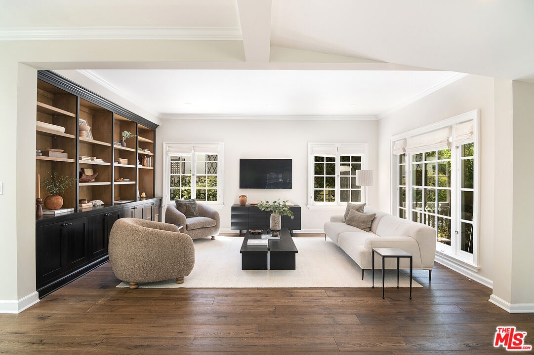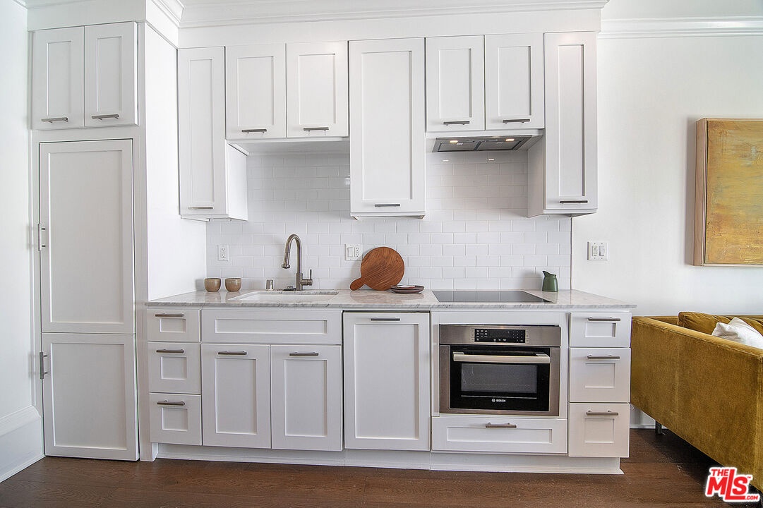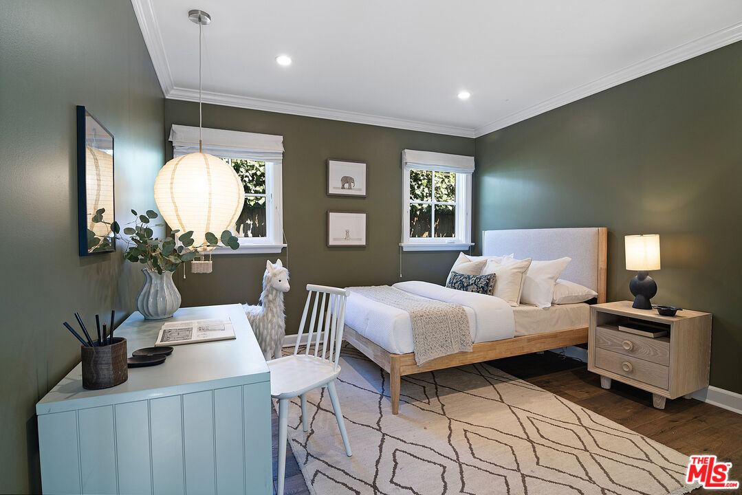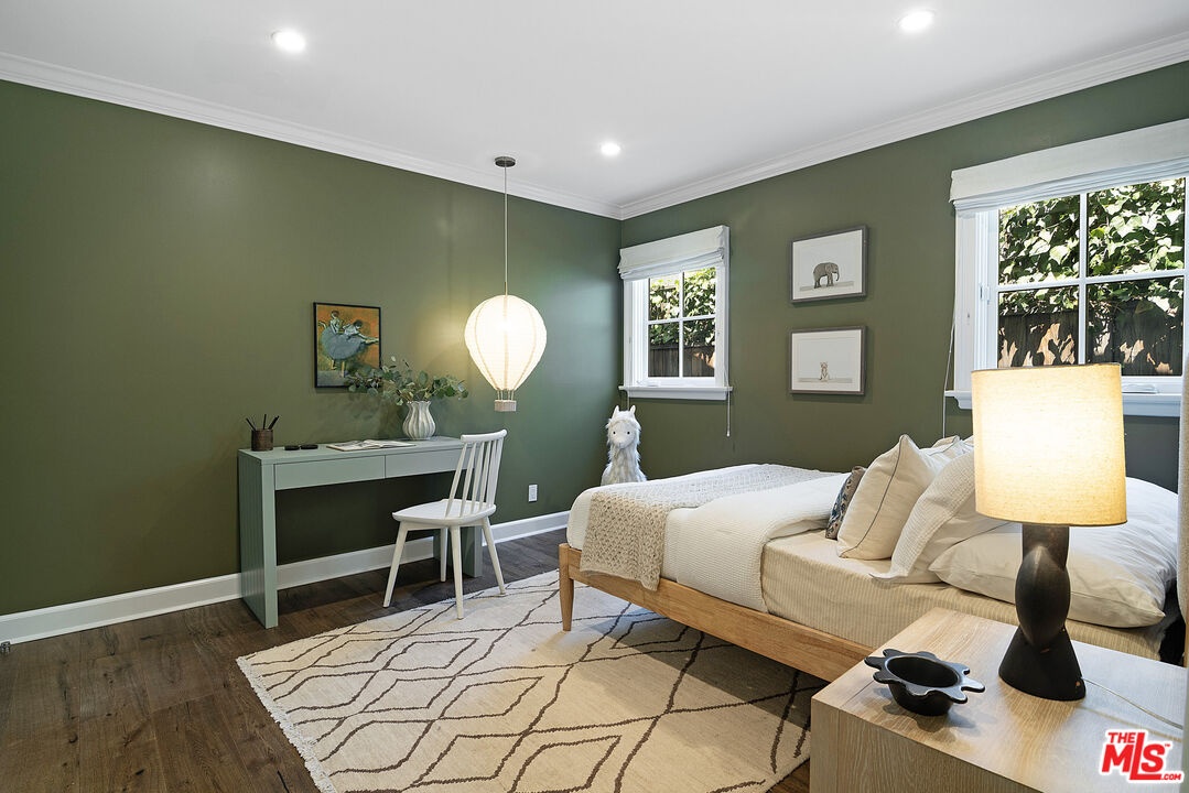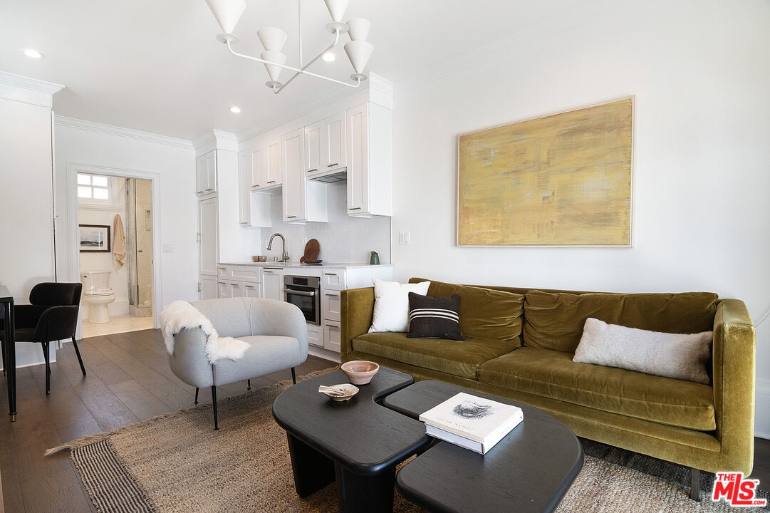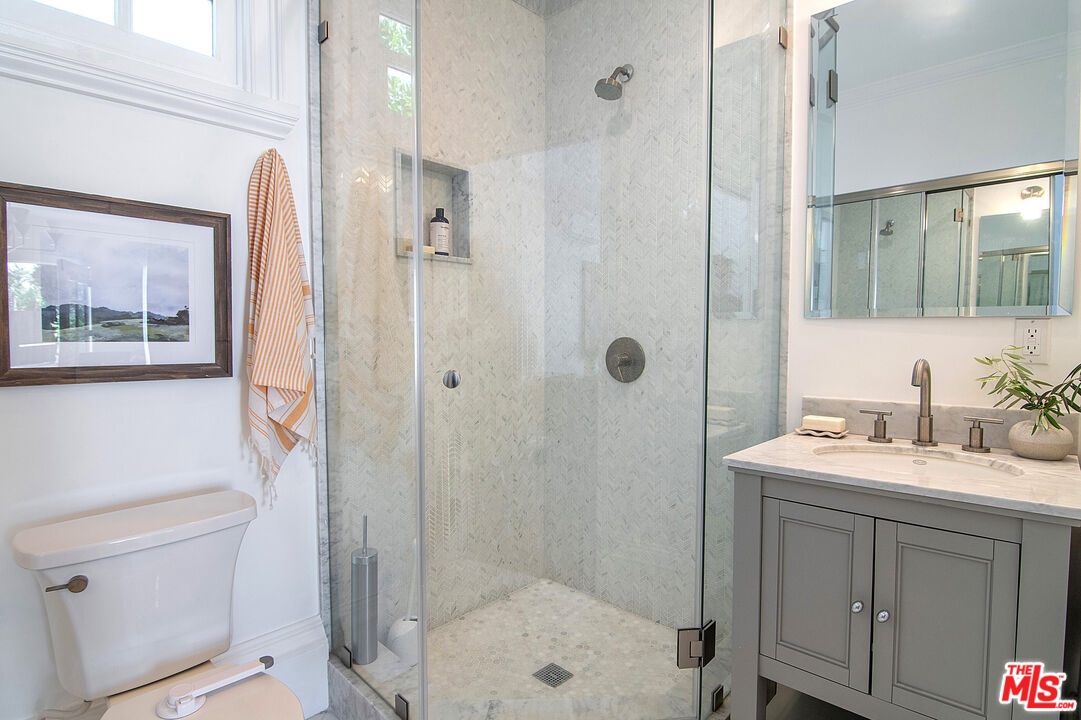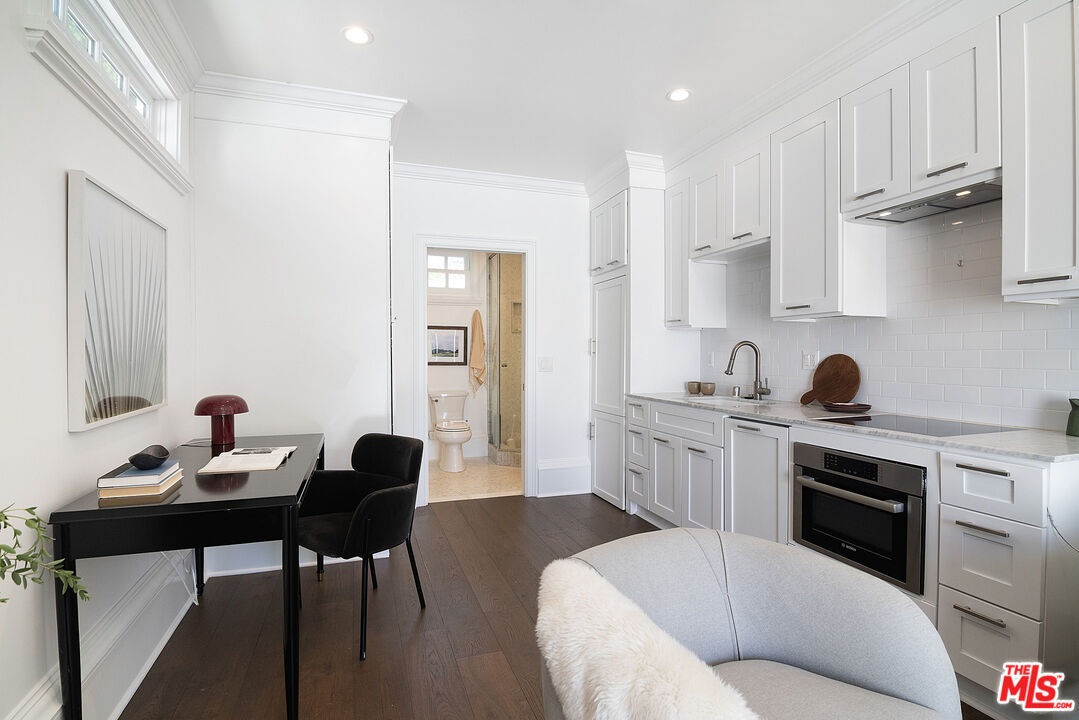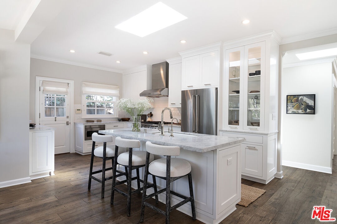 Entirely reimagined and designer remodeled ultra light + bright Single Story Bespoke Timeless Sophisticated Spanish set up for quintessential California indoor/outdoor living with 4 bedroom suites & sunshine everywhere in prime Miracle Mile location! Mini compound features over 2000 sq ft of open floor plan living space great for entertaining, wide plank wood floors, abundant natural light from large windows & skylights everywhere! Living room with built in wall unit is open to the dining room and kitchen. Gourmet kitchen has abundant storage + marble topped counter space, a center island with breakfast bar, Kitchenaid fridge/freezer + range + dishwasher, large skylight over the island, built-in microwave. Side door off the kitchen opens halfway for cross breeze. Coat closet and laundry room with generous storage in the hallway. 3 en-suite bedrooms in the main house each have beautifully appointed designer bathrooms. Center hallway flooded with light through skylight and 2 full glass doors. Primary bedroom is en suite with double French doors to the yard, large bath with double vanity + separate shower and tub + walk-in closet. 31 foot long pebble tech swimmers pool with jacuzzi + water feature + new pool cover in completely hedged private yard. Hardscape deck for lounging and dining alongside an outdoor architectural fireplace. Newer construction ADU opens with double doors to the new driveway and has a full kitchen and en-suite bath with shower. Award worthy artistic landscaping with olive trees and succulents. Hardwood floors, central HVAC, new roof, new wide driveway with remote access. CAT6 wiring throughout for Wifi, security cameras. Amazing location close to The Grove, shops and restaurants. The perfect mix of entirely reimagined in amazing designer timeless taste, flooded with sunshine, Spanish character in prime Miracle Mile location!