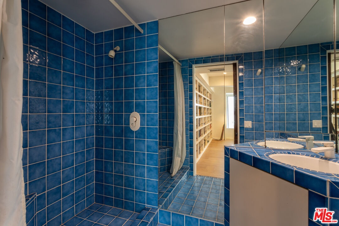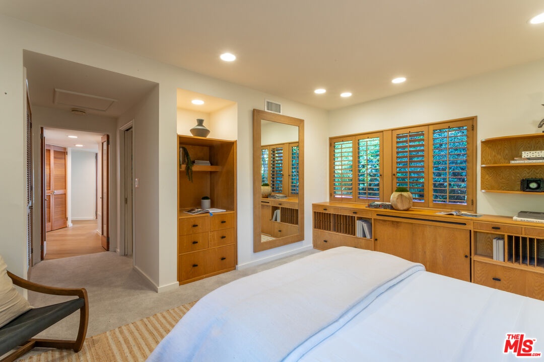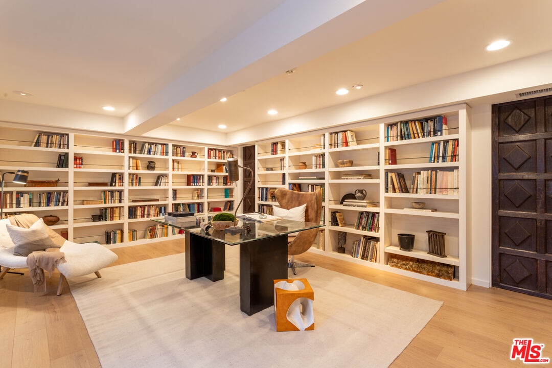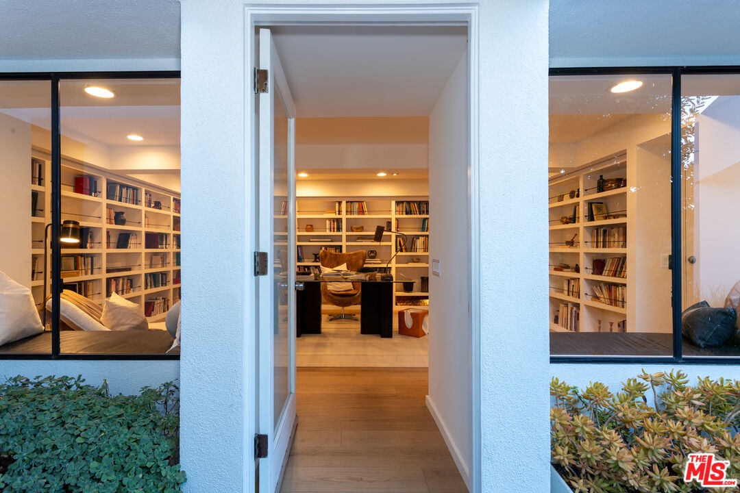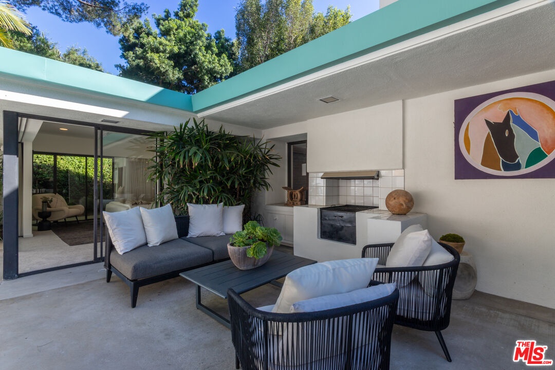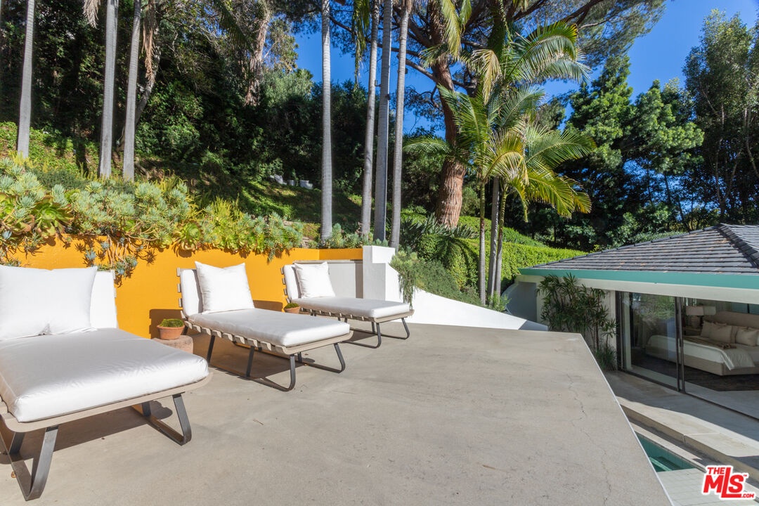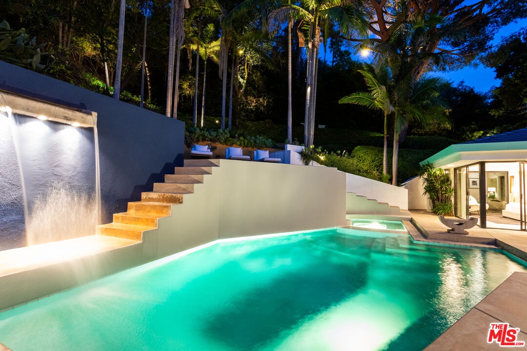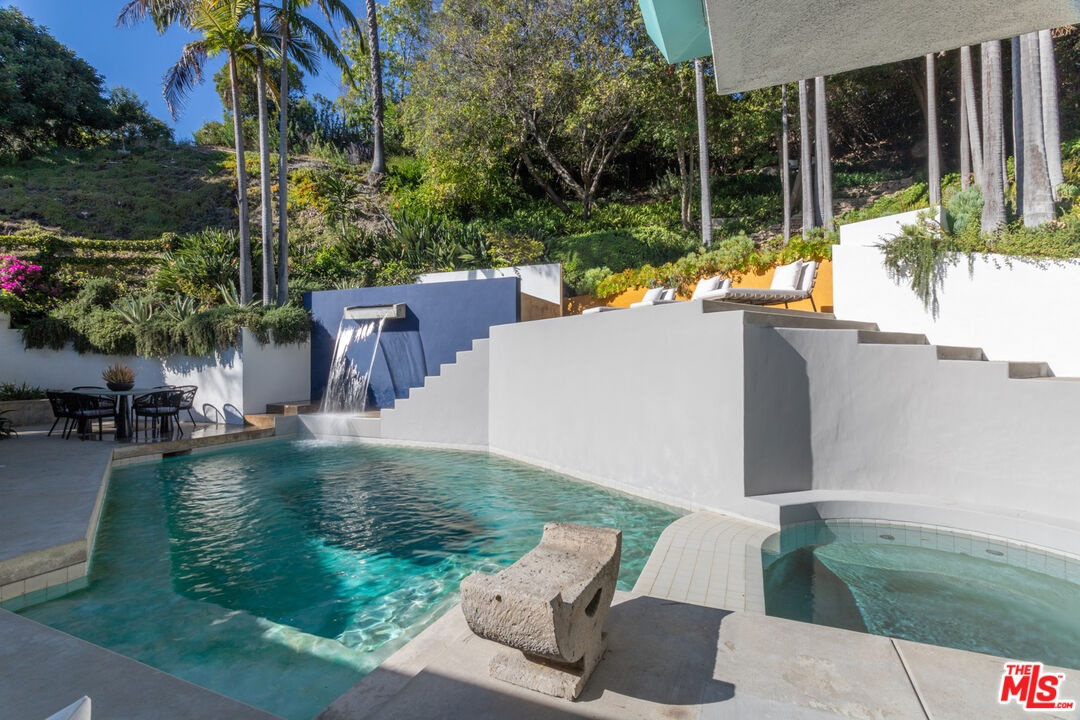 Offered for the first time in over 40 years, this thoughtfully restored home is set above the street and up a private drive in the coveted Outpost Estates, and provides exceptional privacy, design, and scale. Originally built in 1951 by Douglas McLellan & Associates and reimagined by architects Luis Ortega (1978) and Mark Enos (1986), the changes were inspired by Mexican architect Luis Barragan with warm, modern livability. The property has been featured in numerous fashion and editorial photos, including primary work by Herb Ritts, a reflection of its distinctive design and visual appeal. The main residence includes approximately 2,211 square feet with 2 bedrooms and 2 baths, featuring clean lines, preserved period details, thoughtful updates throughout, and a seamless indoor-outdoor flow. Natural light moves effortlessly through the interiors, opening to inviting outdoor spaces designed for both entertaining and retreat. Set on an expansive approximately 19,991 square foot lot, the grounds are anchored by terraced gardens, an architectural pool, connected spa, and a striking waterfall, along with thoughtfully composed outdoor areas that enhance the property's indoor-outdoor lifestyle. A lower level of approximately 600 square feet is a flexible space, currently utilized as a home office with a three-quarter bath and a temperature-controlled wine cellar. It is well suited for a third bedroom or simply additional living space. This is a rare offering that balances architectural significance, extreme privacy, and modern lifestyle in one of the most desirable pockets of the Hollywood Hills.