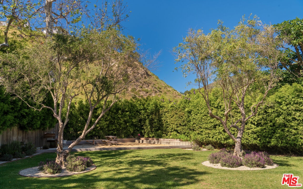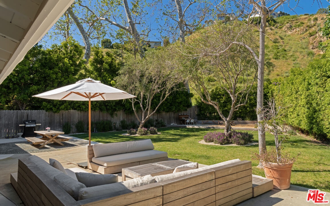 Located on more than a quarter-acre at the end of a cul-de-sac above Trancas, this peaceful single-level home has open, bright, contemporary interiors and expansive outdoor entertaining areas with gorgeous mature sycamore trees. The highly desirable gated community of Malibu West offers exceptional privacy and scenic surroundings, with views of verdant hillsides.Beautifully updated for comfort and style, the home's main living area is a living/dining great room and adjoining kitchen. A pair of extra-wide sliding glass doors face the backyard and create an easy indoor-outdoor flow, with wood floors, abundant natural light, and comfortable furnishings. The kitchen enjoys backyard views and also looks out to the side yard, and features Thermador appliances, a counter with bar seating, a built-in breakfast nook, and generous cabinet and storage space, including a pantry/mud room.The home's four bedrooms include a bedroom with en-suite on one side of the entry and three on the other. Of these, one is currently configured as an office, while another is the owner's suite, complete with a large closet, sliding glass doors to the backyard, and an updated bath with dual sinks, dual-head shower, and direct access to the garden.The backyard is very private, with ample room for recreation and entertaining, including dining and lounging areas, a barbecue, picnic tables, lawn, lovely landscaping, and a raised-bed vegetable garden. A dedicated children's play area includes a sandbox and separate playroom, offering additional flexibility for families. The side yard is home to a barrel sauna and cold plunge.The lease includes one garage space, plus room for four cars in the driveway, and a washer and dryer. Access to beach and tennis court rights at the Malibu West Beach Club is included. Close to hiking and equestrian trails, beaches, and the shops and restaurants of Point Dume and Malibu, this home offers a comfortable and well-located coastal setting. Available June through mid-September 2026.