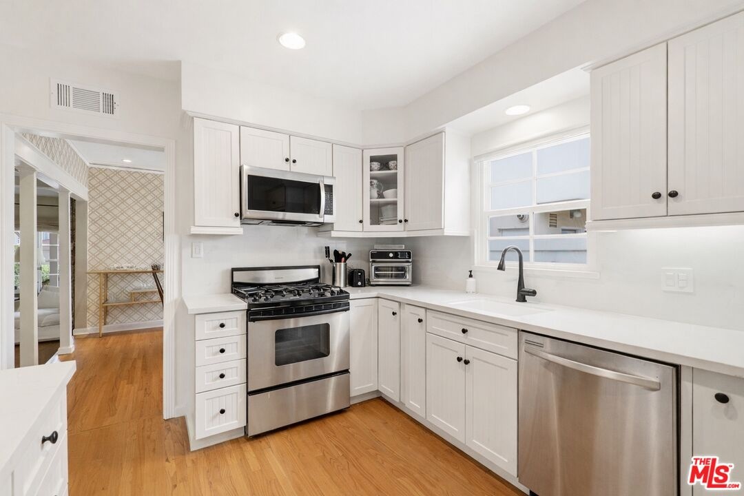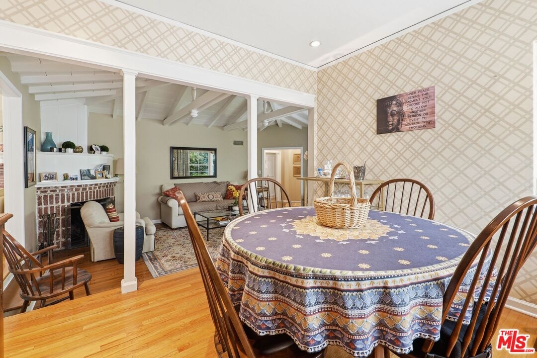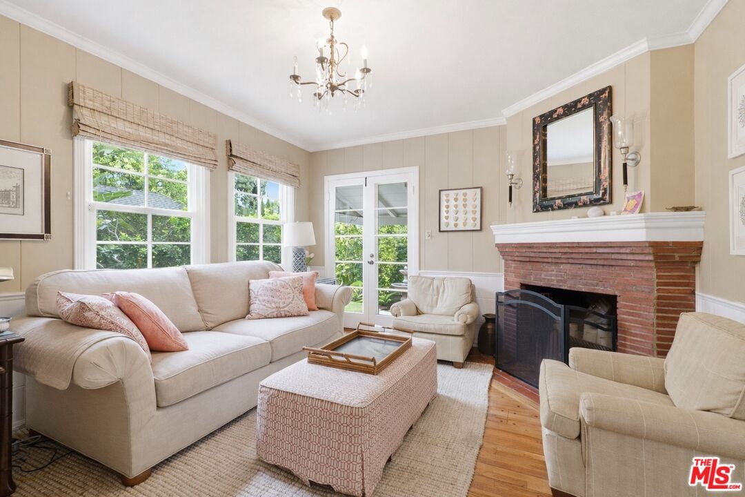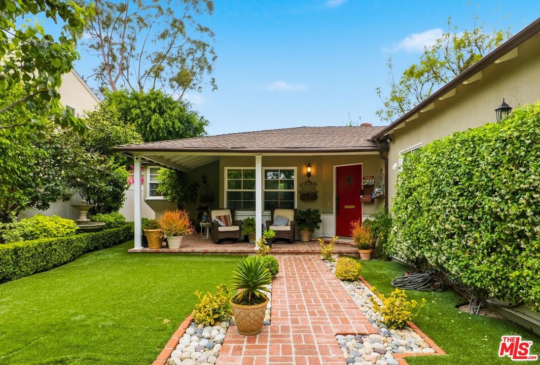 Fully furnished and rich with timeless appeal, this beautifully maintained traditional home in Brentwood Glen offers a warm, inviting living experience. The living room features gleaming hardwood floors, a classic brick fireplace, and striking wood-beamed ceilings that create an airy yet cozy atmosphere filled with natural light. A charming den with its own fireplace opens seamlessly to a lush garden, complete with a tranquil fountain and outdoor fireplace, an ideal setting for both relaxing and entertaining. The bright, updated kitchen is thoughtfully designed with crisp white cabinetry, stone countertops, stainless steel appliances, and abundant natural light. Just off the kitchen, a cheerful and functional office space, paired with a convenient half bath, makes working from home effortless. Two generously sized bedrooms feature bay windows and ample storage, while a step-up formal dining room adds architectural interest and an elegant space for gatherings. Outside, the grassy backyard with a covered patio offers a perfect outdoor retreat. The newly landscaped front garden, framed by a charming white picket fence, completes this picture-perfect home filled with warmth, charm, and character.