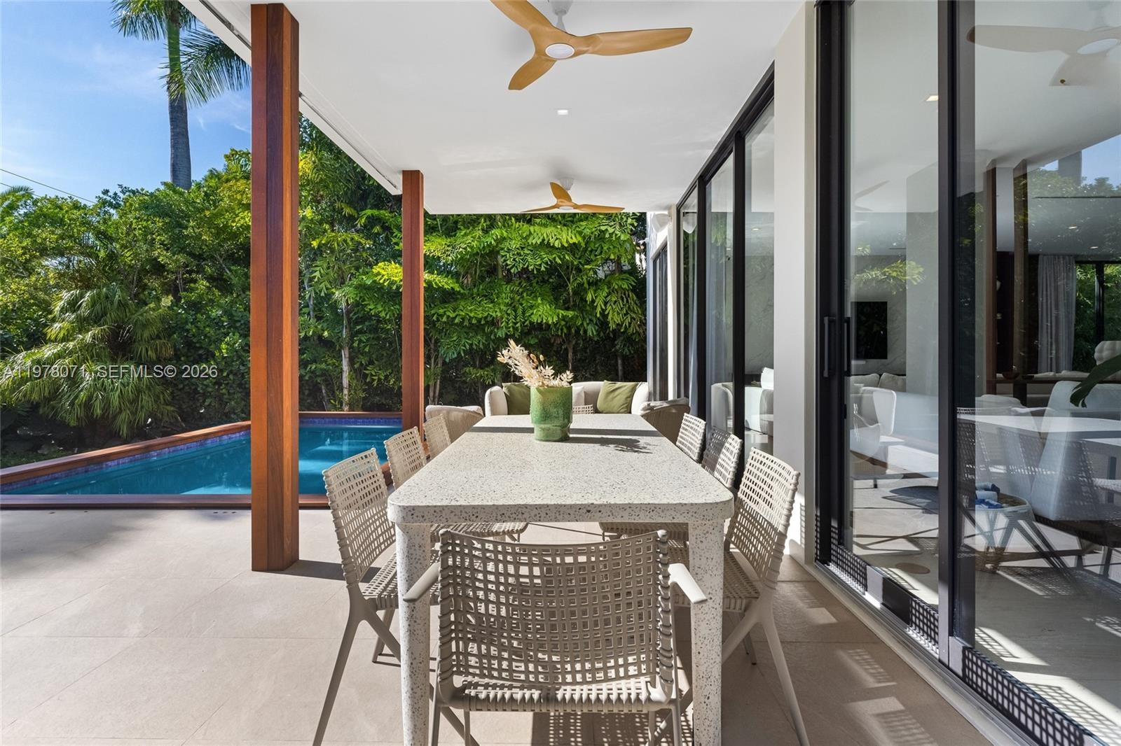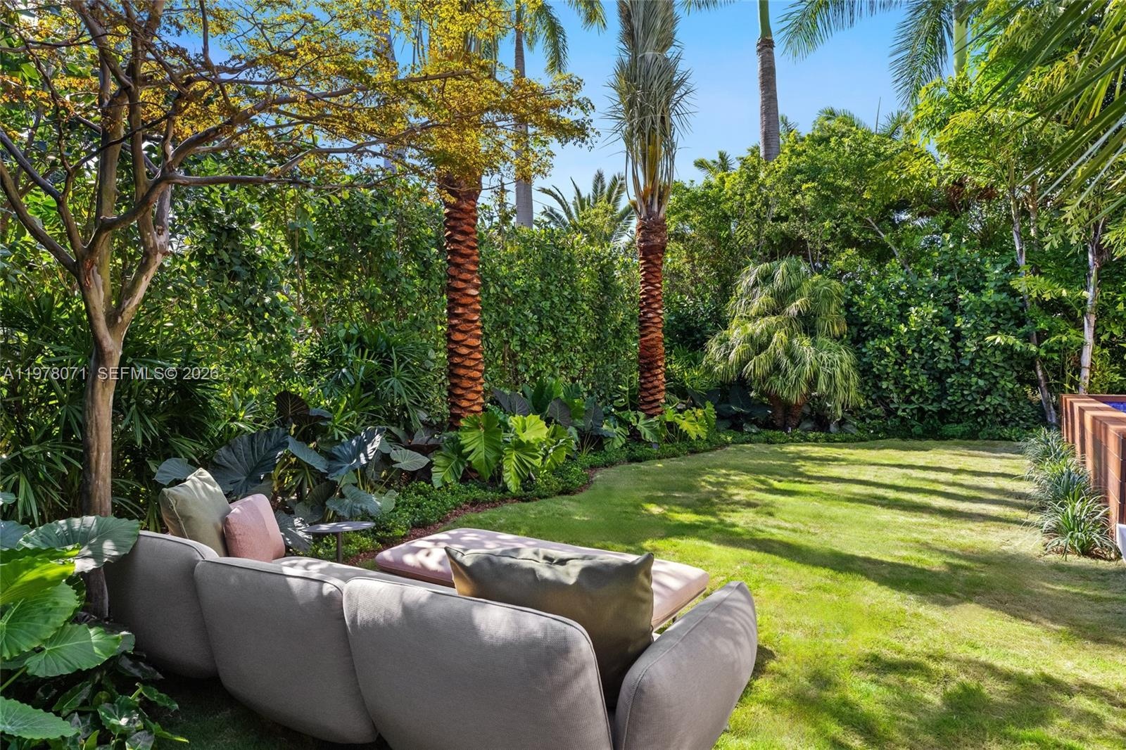 The fully transformed outdoor environment unfolds as a layered tropical landscape, anchored by mature specimen palms, a 15-foot bridal veil tree, 18-foot bamboo, and a 13-foot Clusia hedge for exceptional privacy. 30-foot buttonwood trees frame the front of the property, enhancing privacy and creating a lush, established arrival experience. A Coralina paver garden pathway with turf inlays weaves through the grounds, creating a sense of movement and discovery, while Ipe-clad pool decking, architectural lighting, and multiple lounge areas complete the setting. A saltwater pool and spa, covered terrace with a custom KE retractable awning, Haiku ceiling fans, and integrated outdoor surround sound create a fully immersive tropical retreat for both entertaining and everyday living.