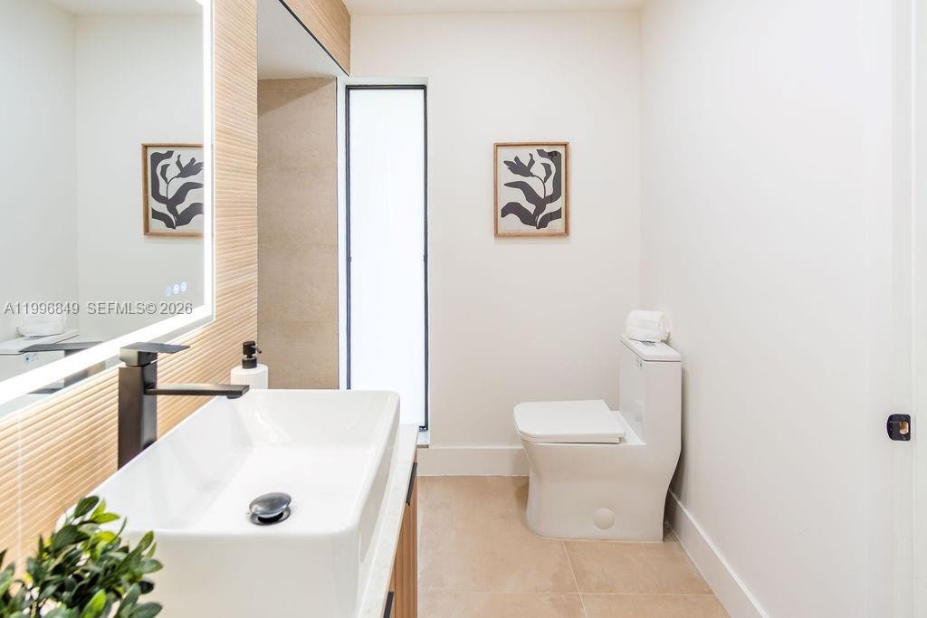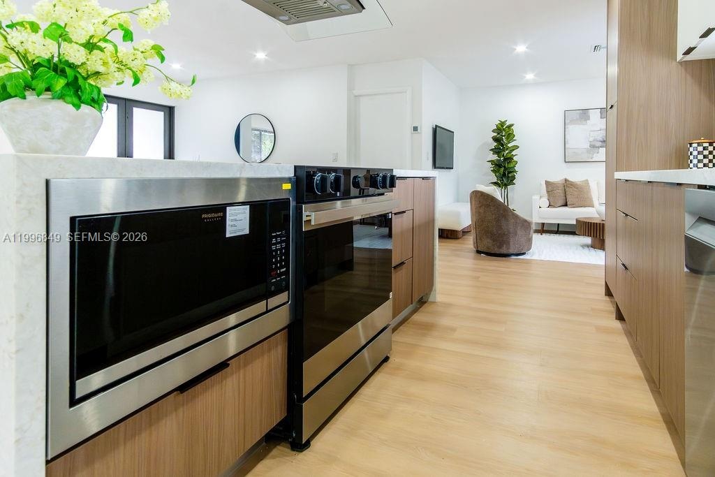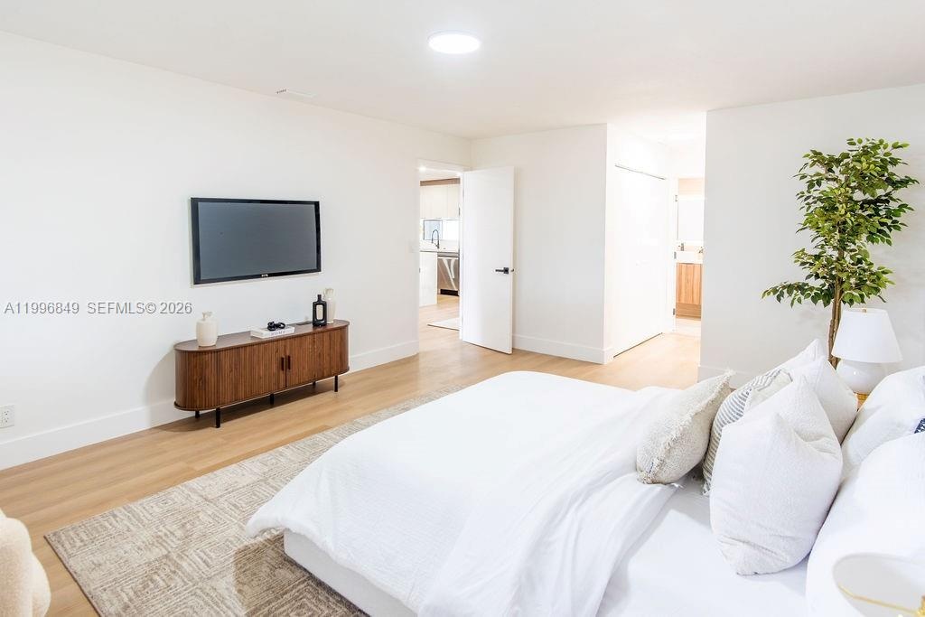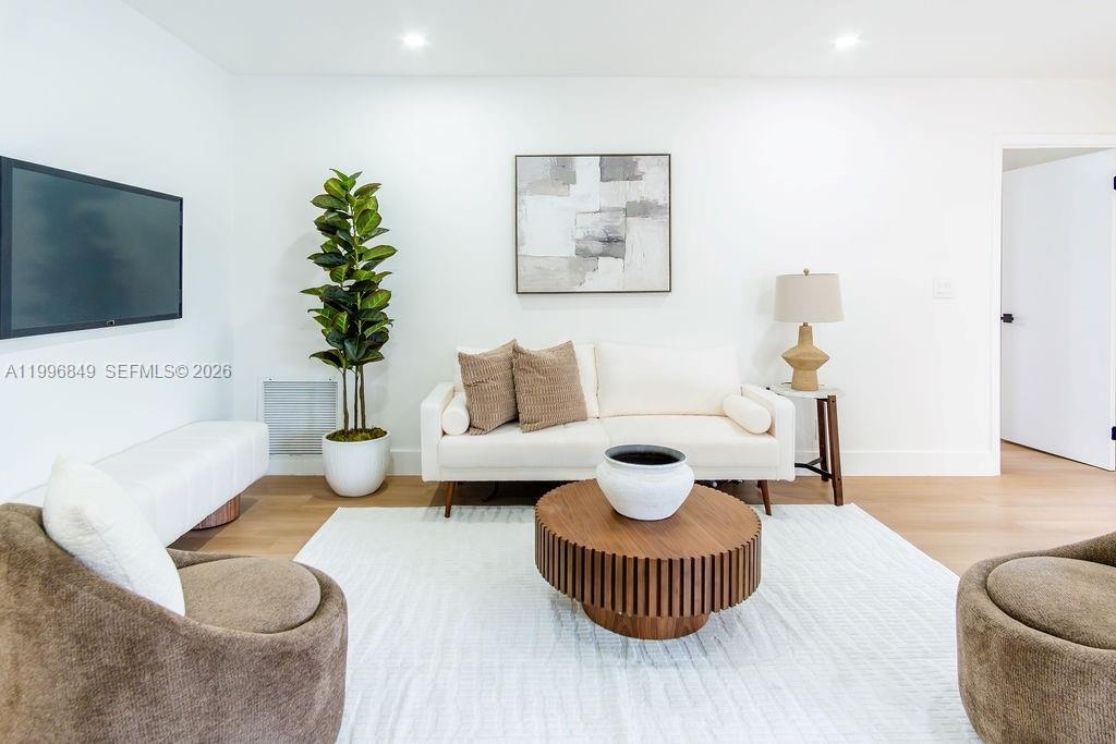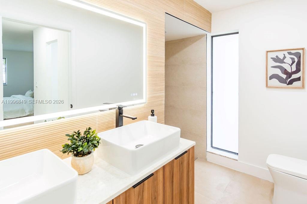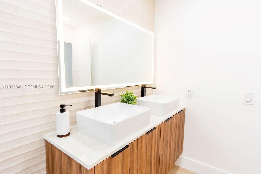 Inside, the home features a modern aesthetic with warm wood-tone cabinetry, quartz countertops, Samsung appliances, and vinyl flooring throughout. The bright, open layout is filled with natural light, and the updated bathrooms include sleek illuminated mirrors for a contemporary touch.