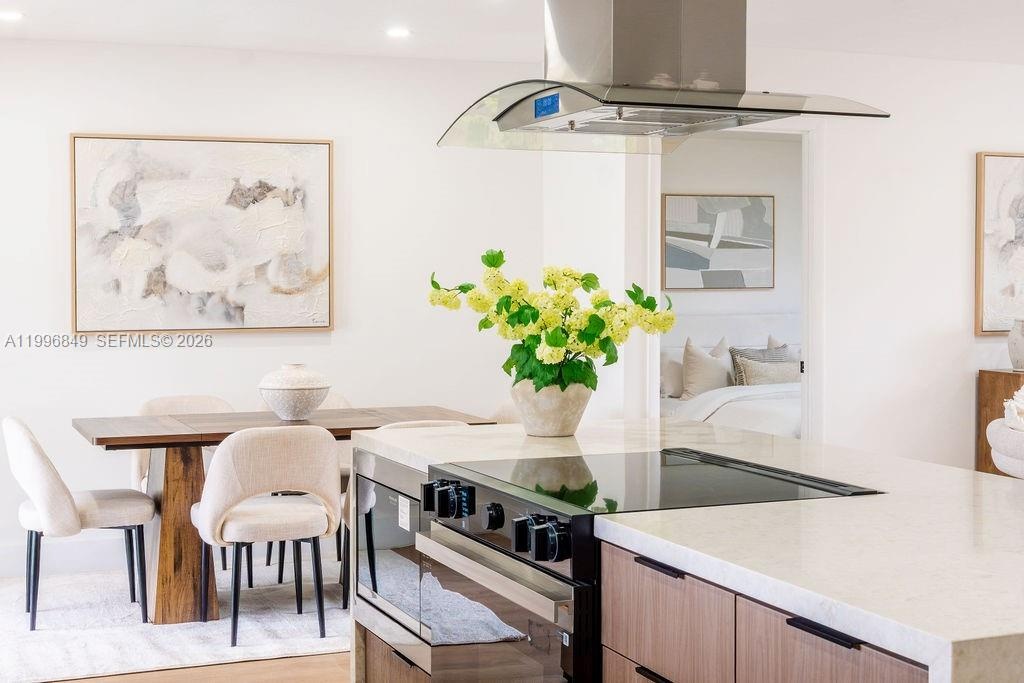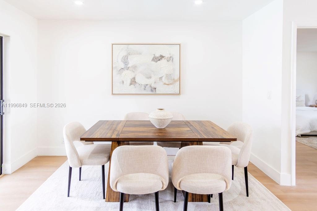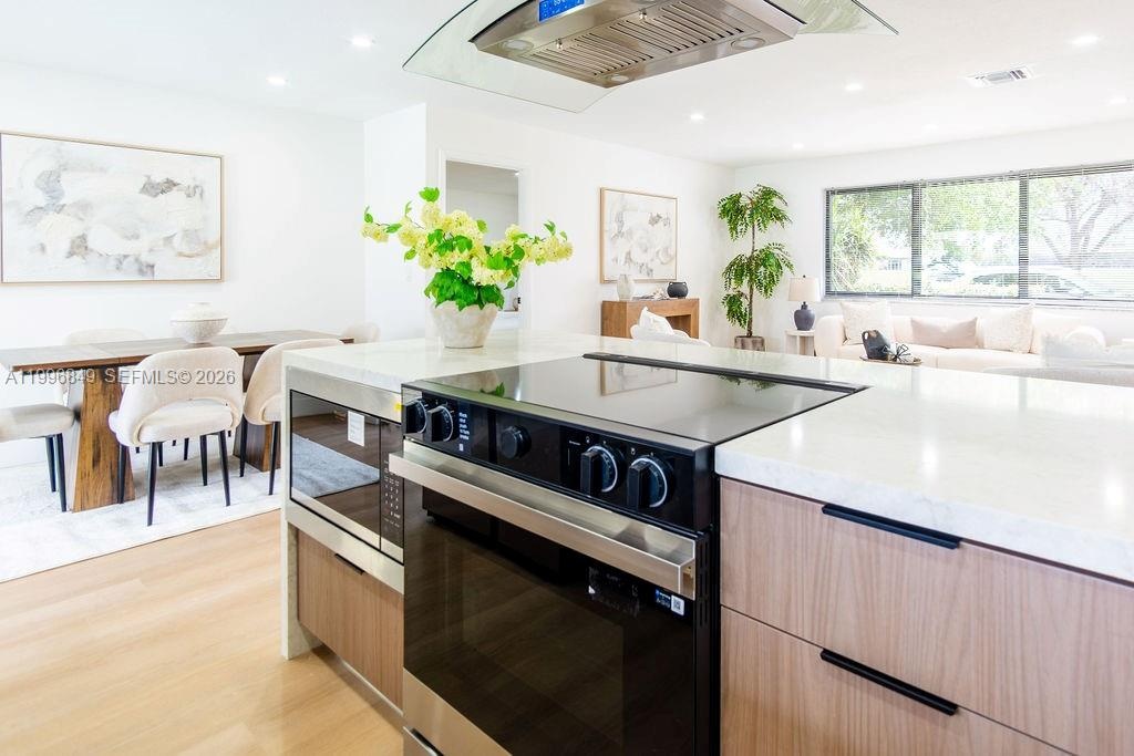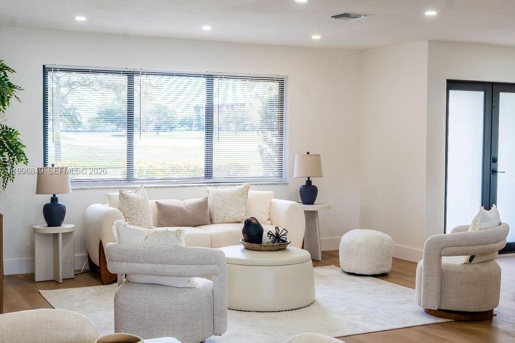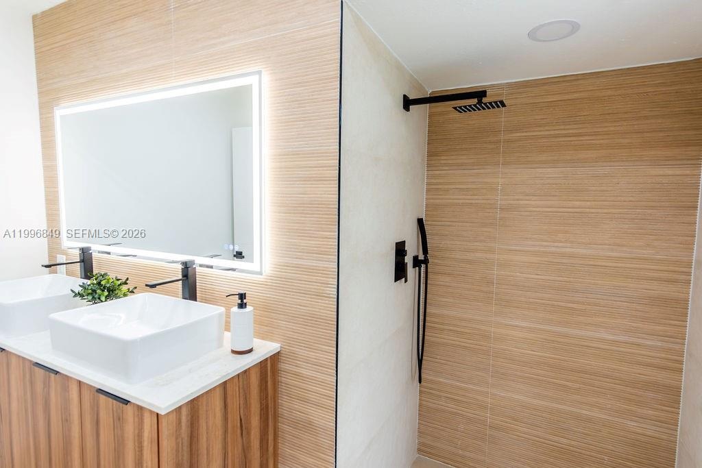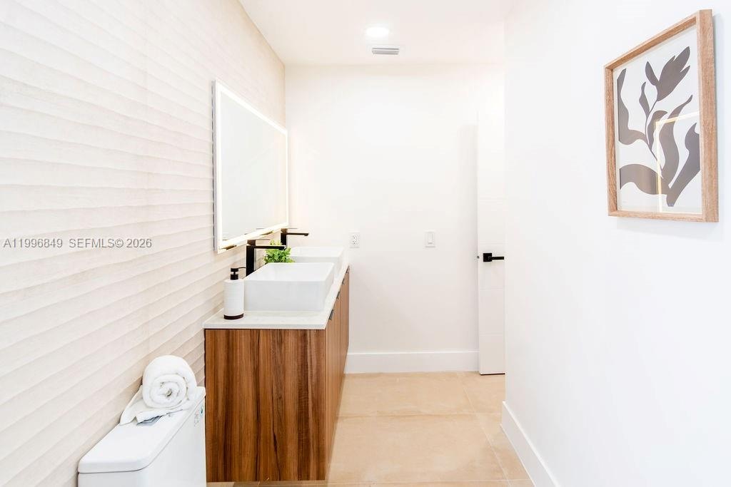 Inside, the home features a modern aesthetic with warm wood-tone cabinetry, quartz countertops, Samsung appliances, and vinyl flooring throughout. The bright, open layout is filled with natural light, and the updated bathrooms include sleek illuminated mirrors for a contemporary touch.