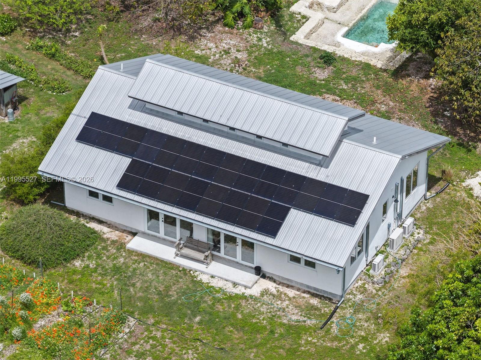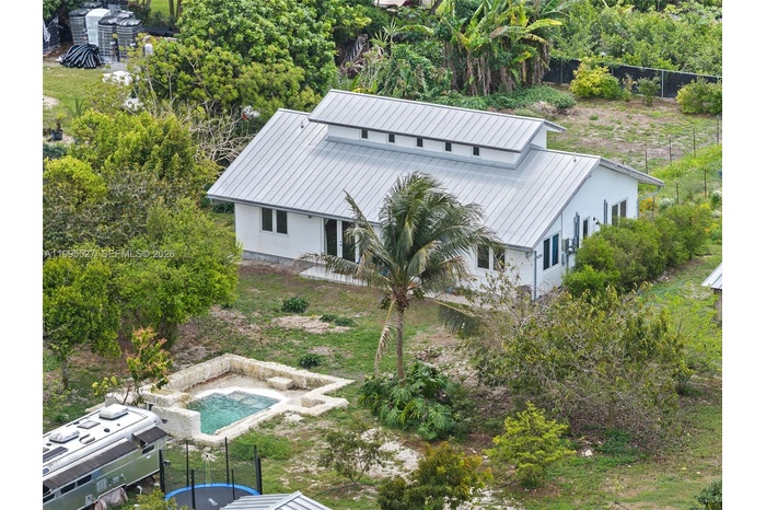 Tucked away on 1.54 lush acres in the Redlands, this thoughtfully designed eco-friendly, owner-built estate blends sustainability with serene living. Completed in 2022, the 3BD/2BA residence offers 1,500 SF plus a charming 200 SF loft—ideal for office, studio, or retreat—accessed by a beautiful wood staircase. Enjoy a light-filled interior, solar panels, and two potable wells for home and agriculture. Outdoors, discover a swimmable grotto with waterfall, greenhouse, three outbuildings, and organic garden. A tropical paradise with over 60 tree orchard including mango, avocado, lychee, mamey, jackfruit, and more—Enjoy your private farm-to-table sanctuary.