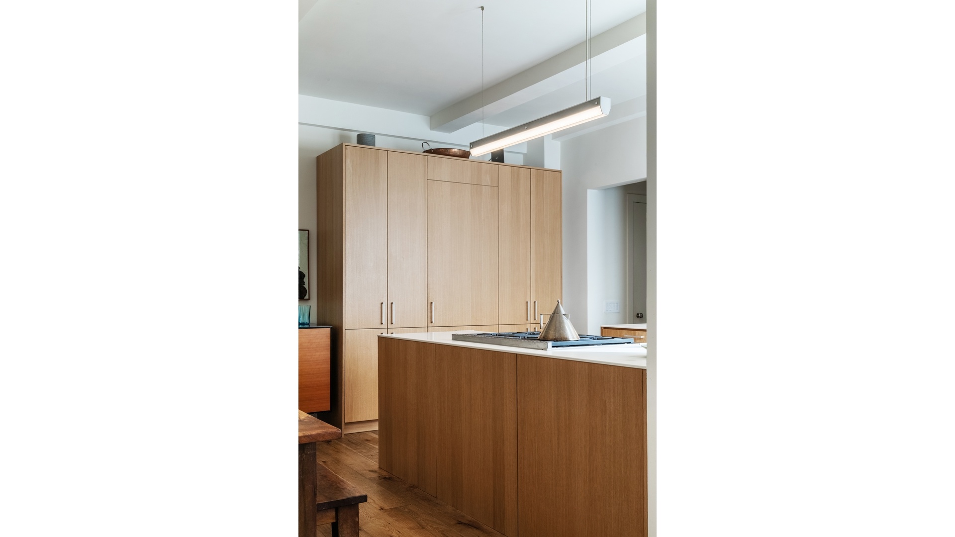 The open chef's kitchen, featured by Space Theory, is both striking and highly functional. Outfitted with fully integrated Bosch appliances, a 36" Wolf range, and a double stainless steel sink with a Dornbracht faucet, it's designed for both everyday ease and entertaining at a high level.
