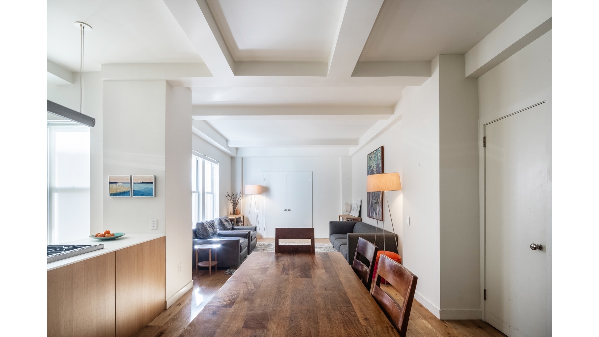 Bathed in beautiful southern and western light, the apartment opens into a gracious entry foyer anchored by wide-plank oak floors that run seamlessly throughout and complimented by soaring beamed ceilings. Every detail has been considered-from upgraded electrical and custom lighting to new plumbing carried all the way to the risers. Solid core doors with refined Hamilton Sinkler hardware add a quiet sense of luxury. And oh yes, every window fitted with custom solar and blackout shades.