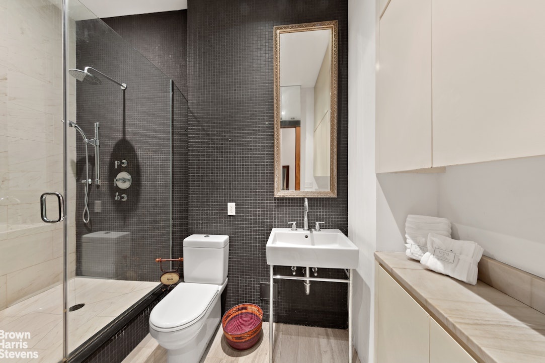 The beautiful renovated oversized "spa-like" bathroom has an extra-large shower with beautiful Carrara tiles, high ceilings & excellent storage.