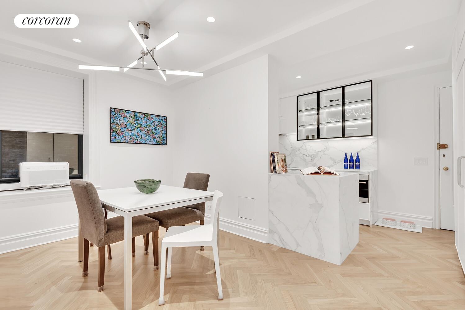 The open dining room seamlessly flows into a state-of-the-art kitchen, designed for both functionality and style. It boasts top-of-the-line appliances, including a Wolf 4-burner cooktop, Wolf oven, separate Wolf microwave, 48" Sub-Zero refrigerator, and a Miele dishwasher. Elegant bespoke Italian-made Mondiani cabinetry and calacatta marble surfaces provide ample storage and a luxurious finish.