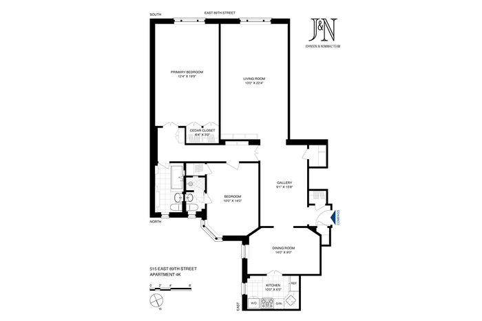 New to Market at Gracie Gardens in Yorkville - Apartment 4K is a gracious two-bedroom, two-bathroom residence with triple exposures and windows in every room. A gallery-like foyer welcomes you home, setting the tone for this thoughtfully designed space.? The sun-filled living room and primary bedroom both face south, offering picturesque views of tree-lined 89th Street and its ?delightful brownstones. The king-sized primary bedroom boasts a double cedar-lined closet, ?ideal for keeping your wardrobe in pristine condition. The second bedroom, complete with an en-suite full bathroom, provides privacy and convenience for ?family or guests. This is a perfect office, tv room, den, or guest room.