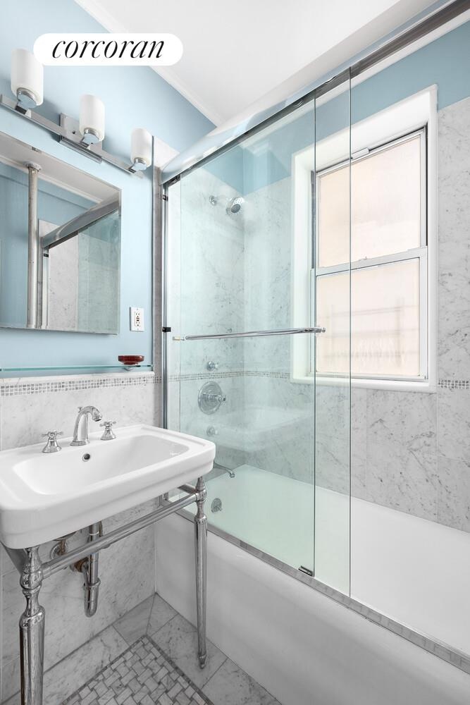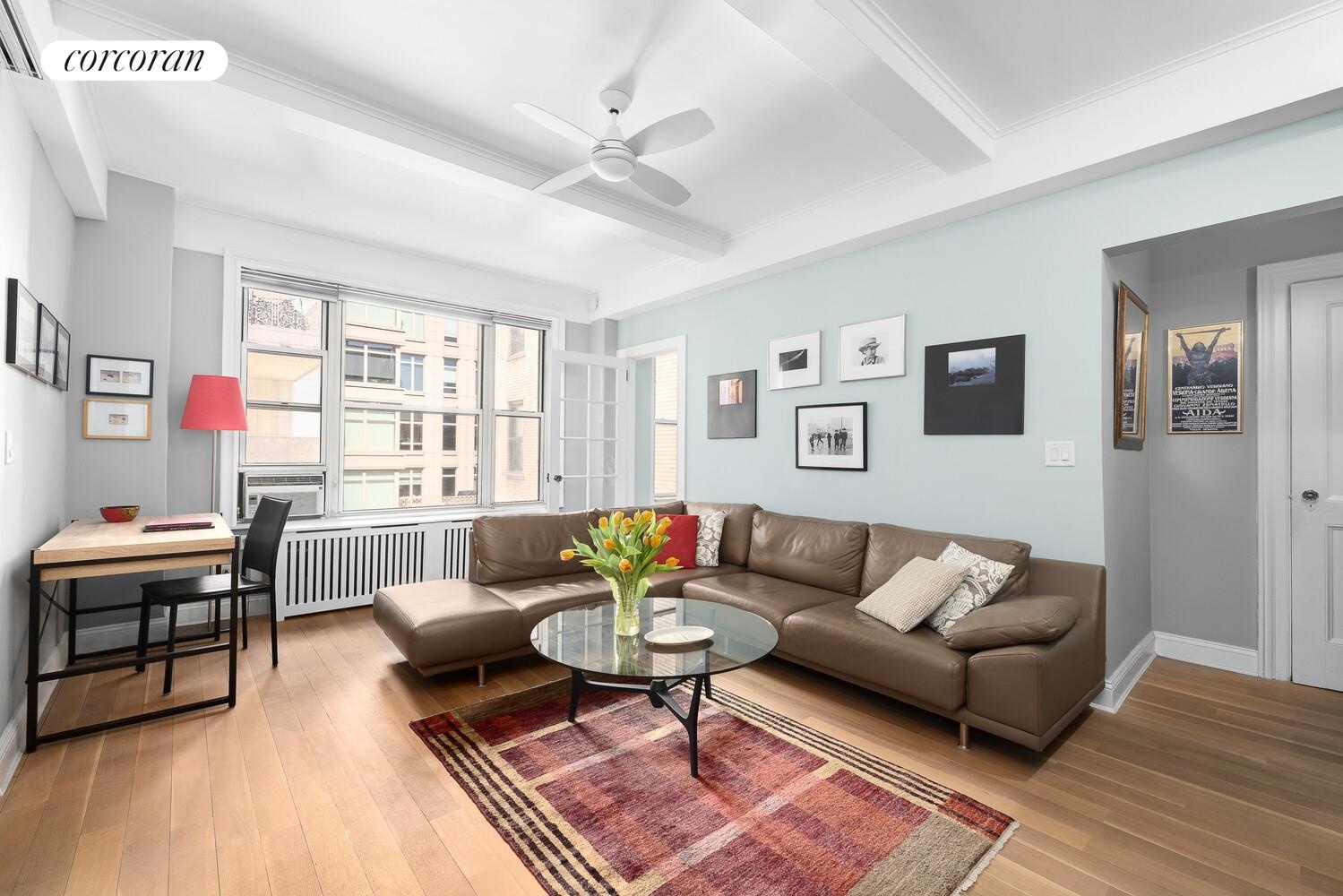 With a formal entry, 9.5-foot beamed ceilings, large windows, new quarter-sawn, white oak floors, skim coated walls and trackless glass sliders separating the sleeping alcove, the atmosphere is open and airy. Because the beautifully renovated, eat-in kitchen is completely separate, this alcove studio operates like a one bedroom with a massive, dedicated living room. The new and classically renovated kitchen boasts gray Pentalquartz counters, an Arabescara honed marble backsplash, Bosch and Fisher Paykel stainless appliances (including a dishwasher) and a Zephyr Breeze range hood. The lovely renovated and windowed bath with basketweave tiling can be made en suite behind the bedroom slider. You'll also love the northern exposure, offering delightful reflected light throughout the day.