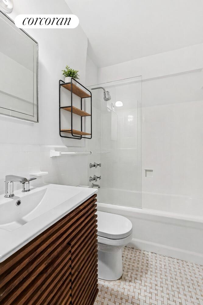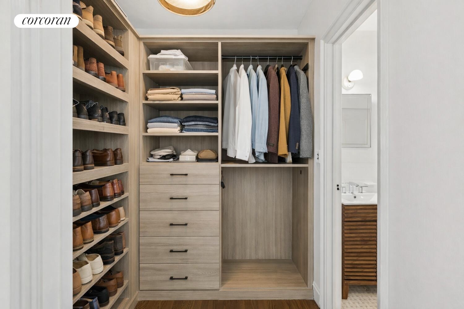 The bathroom has been thoughtfully upgraded with re-glazed tiles and a sleek glass-enclosed shower, creating a clean and modern aesthetic. Custom California Closets provide exceptional storage solutions, easily accommodating everything from a full wardrobe to everyday essentials.
