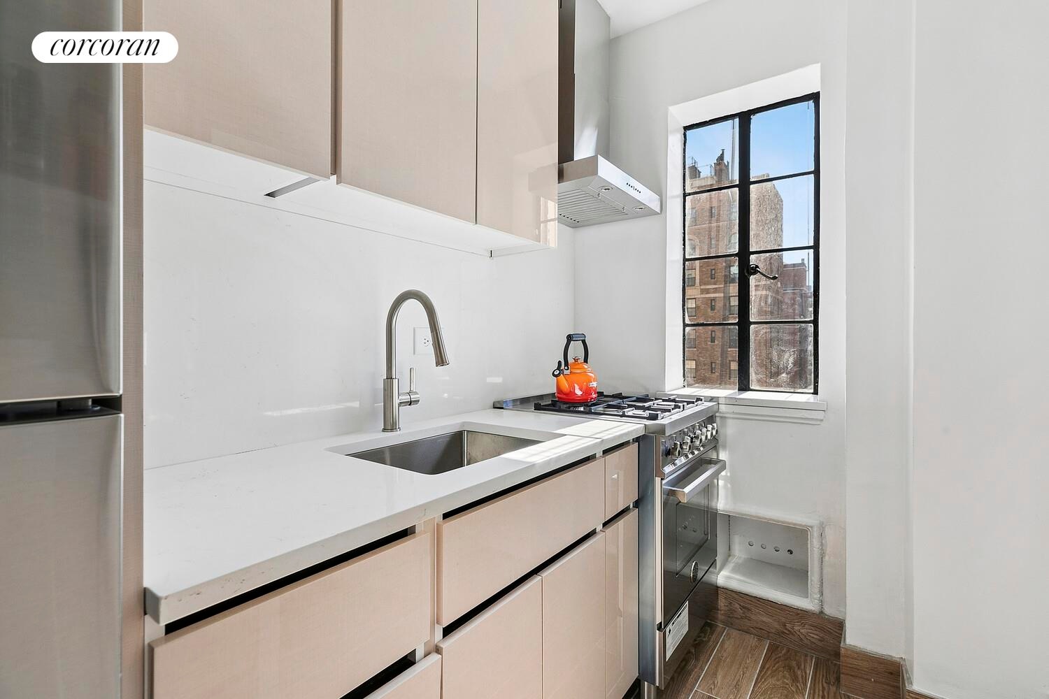 Step into a generously sized living area featuring elegantly refinished wood floors that add warmth and sophistication throughout. The renovated kitchen offers both functionality and charm, complete with an east-facing casement window that fills the space with natural light-mirrored in every window across the apartment.