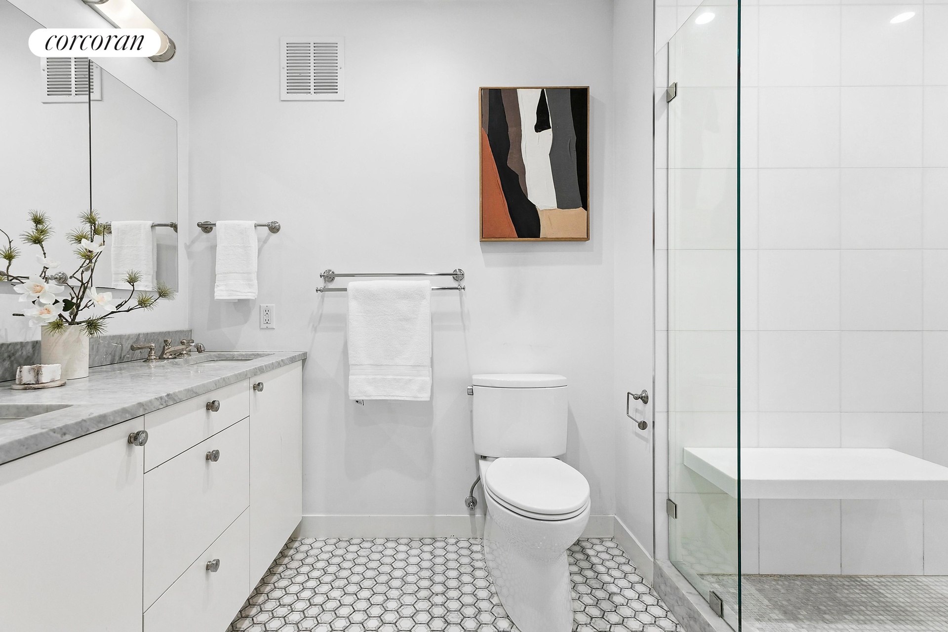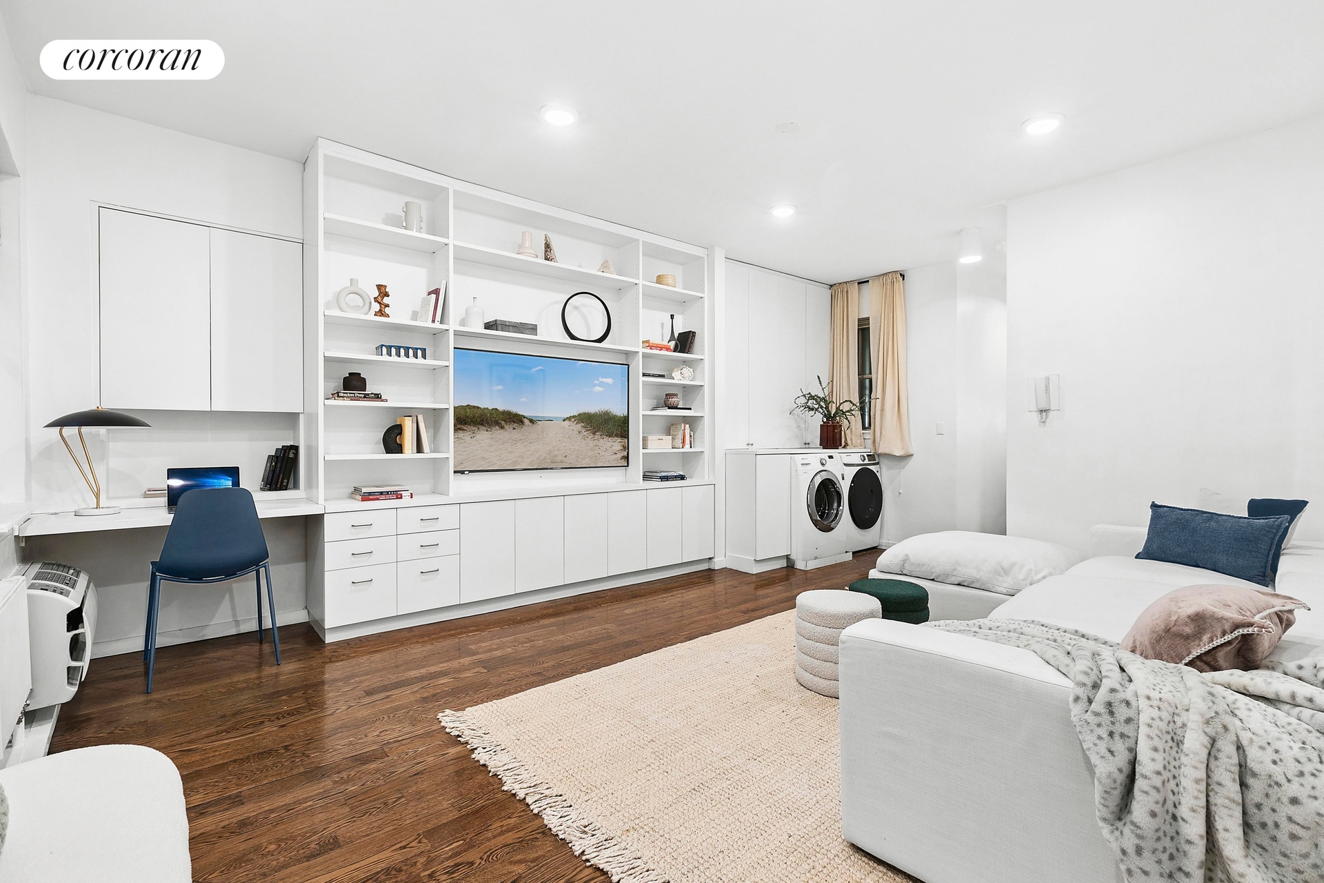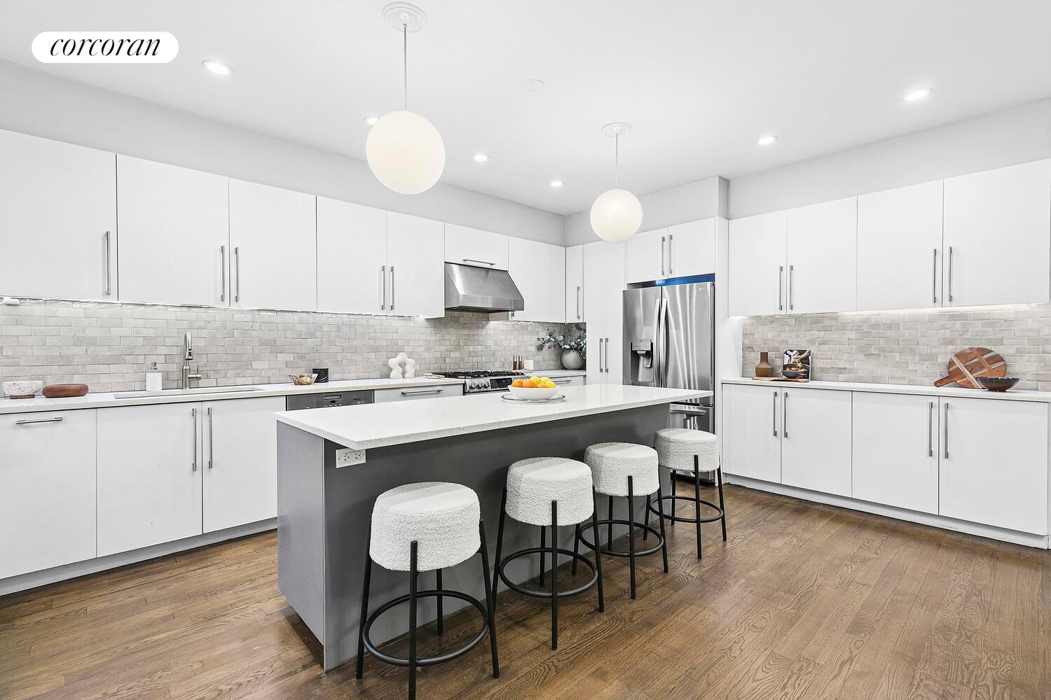 As you enter, you're greeted by an oversized eat-in kitchen and dining area that feels more like a suburban home than a typical city apartment-ideal for everyday living as well as entertaining. The kitchen includes a large breakfast bar, LG refrigerator, GE Profile range, and Miele dishwasher, along with Caesarstone countertops, a fully vented hood, and generous custom cabinetry. This level also features a comfortable living area, two custom closets, and a full bathroom.