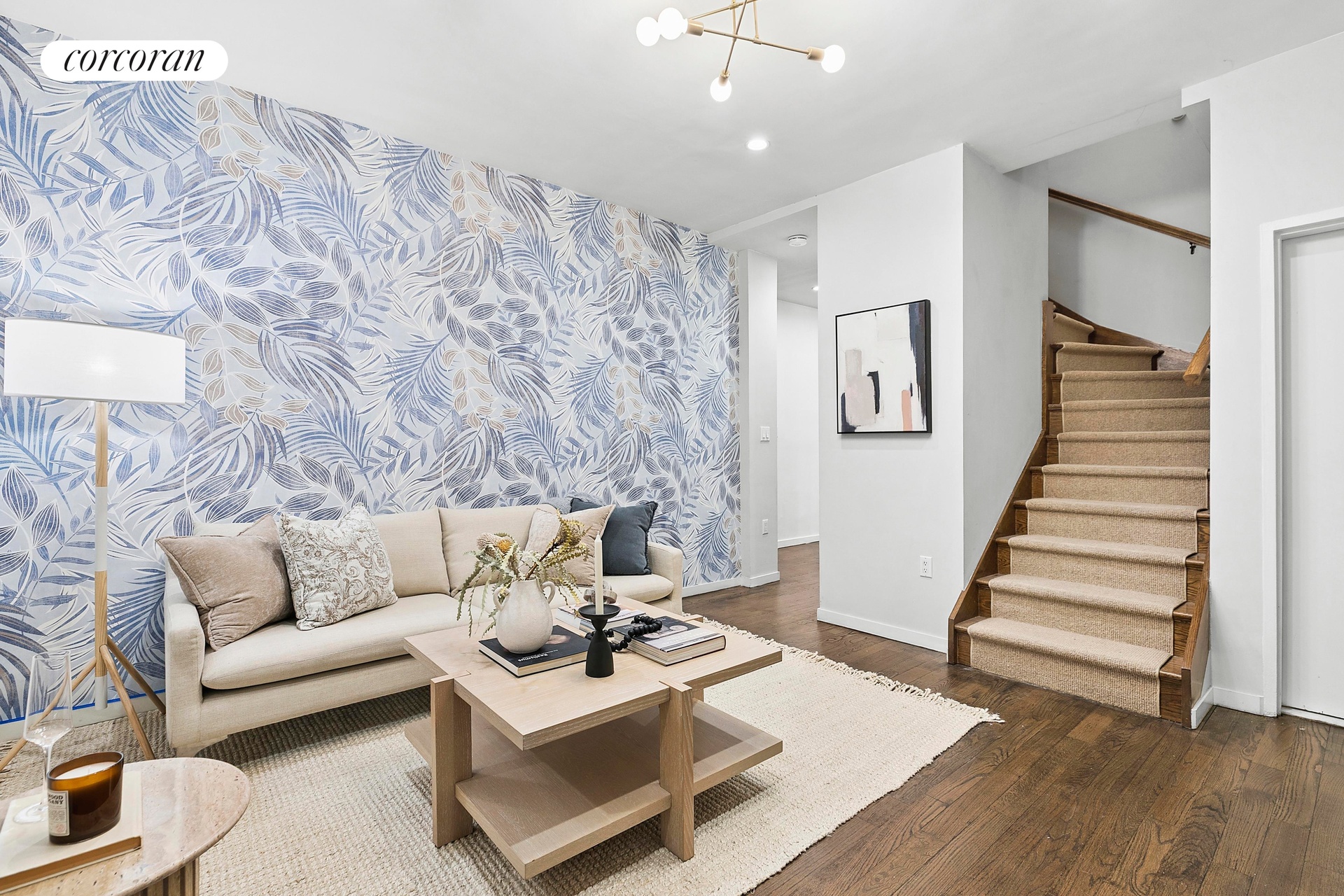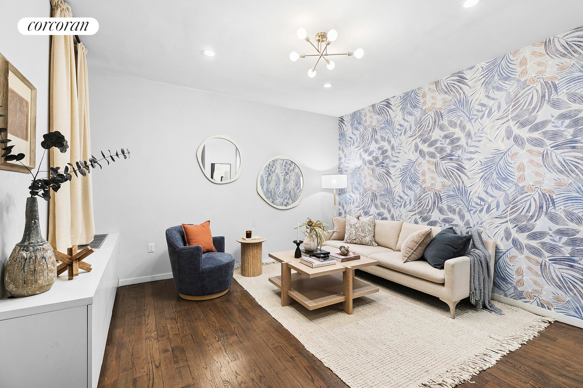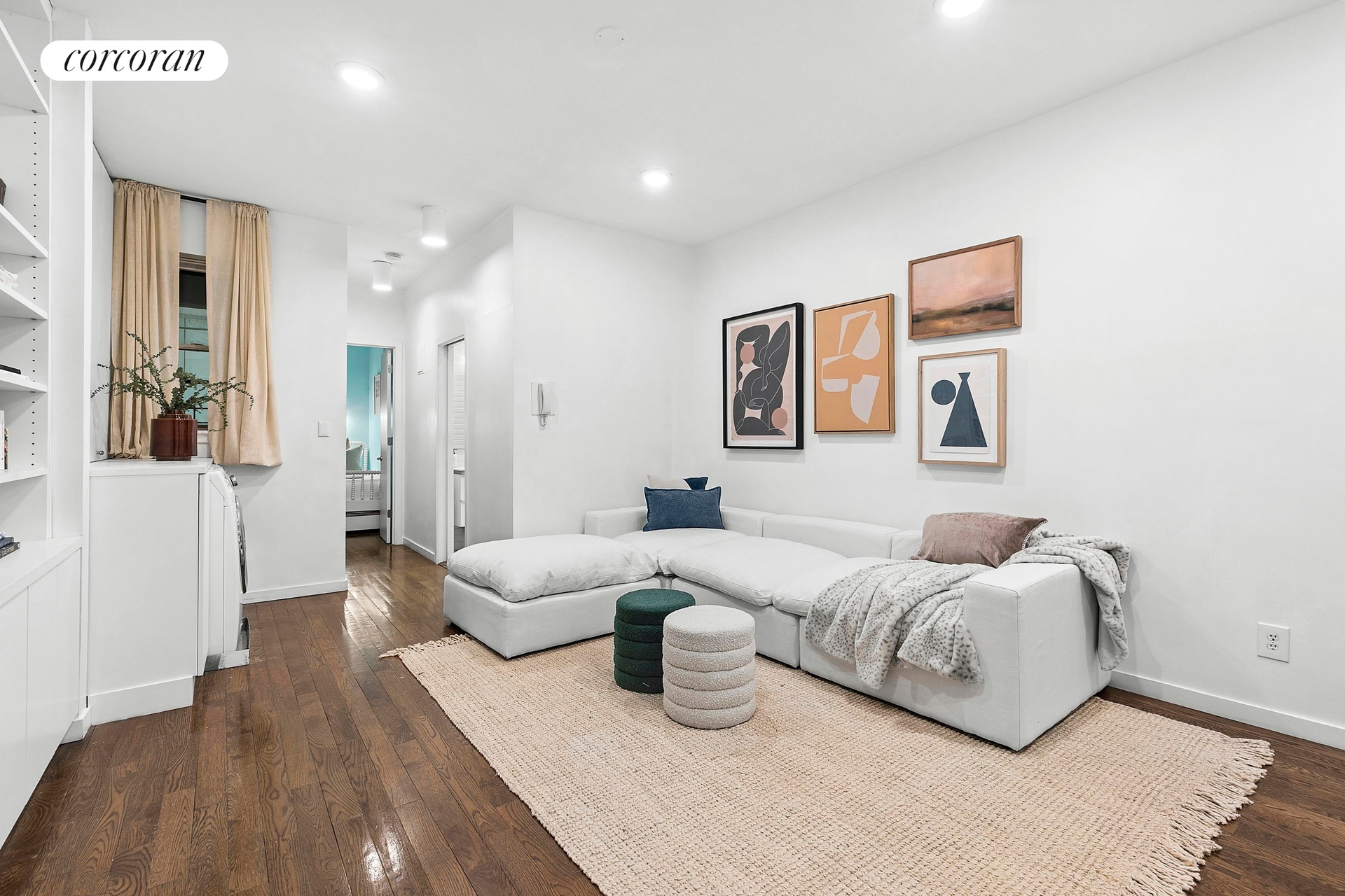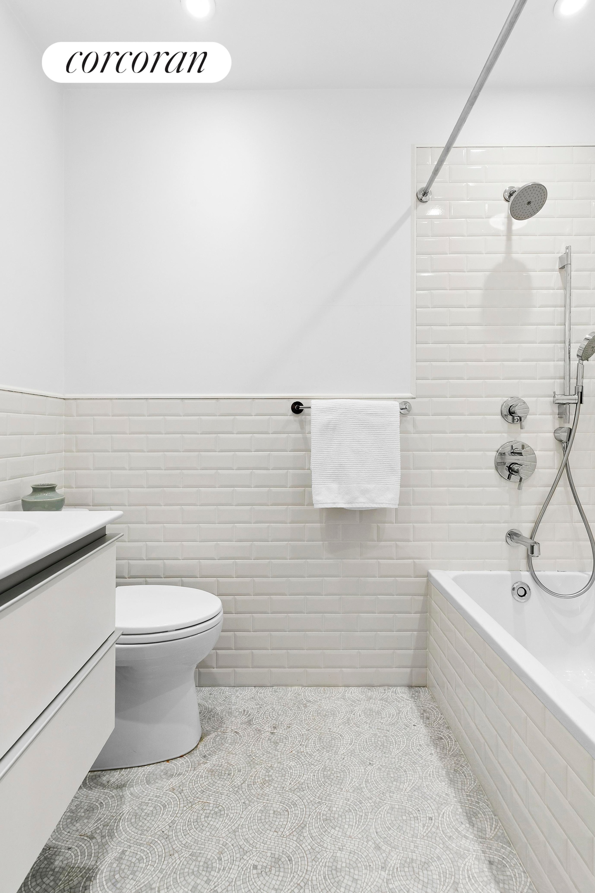 As you enter, you're greeted by an oversized eat-in kitchen and dining area that feels more like a suburban home than a typical city apartment-ideal for everyday living as well as entertaining. The kitchen includes a large breakfast bar, LG refrigerator, GE Profile range, and Miele dishwasher, along with Caesarstone countertops, a fully vented hood, and generous custom cabinetry. This level also features a comfortable living area, two custom closets, and a full bathroom.