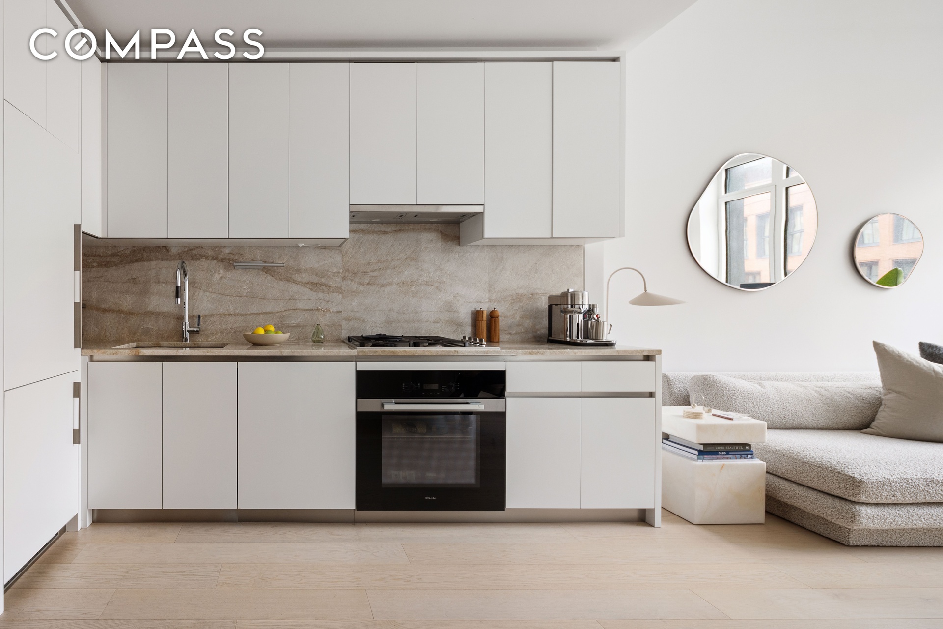Additional highlights include 7-inch-wide plank white oak flooring, massive bronze-finished windows with Caesarstone window ledges, and an open-concept kitchen appointed with Miele appliances, warm-toned quartzite countertops, matte white lacquer cabinetry, architectural cove lighting, and Dornbracht fixtures. The bathroom is elegantly finished with European white oak cabinetry, Calacatta Lincoln marble countertops with undermounted sinks, and a Dornbracht-fitted shower.