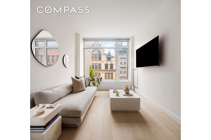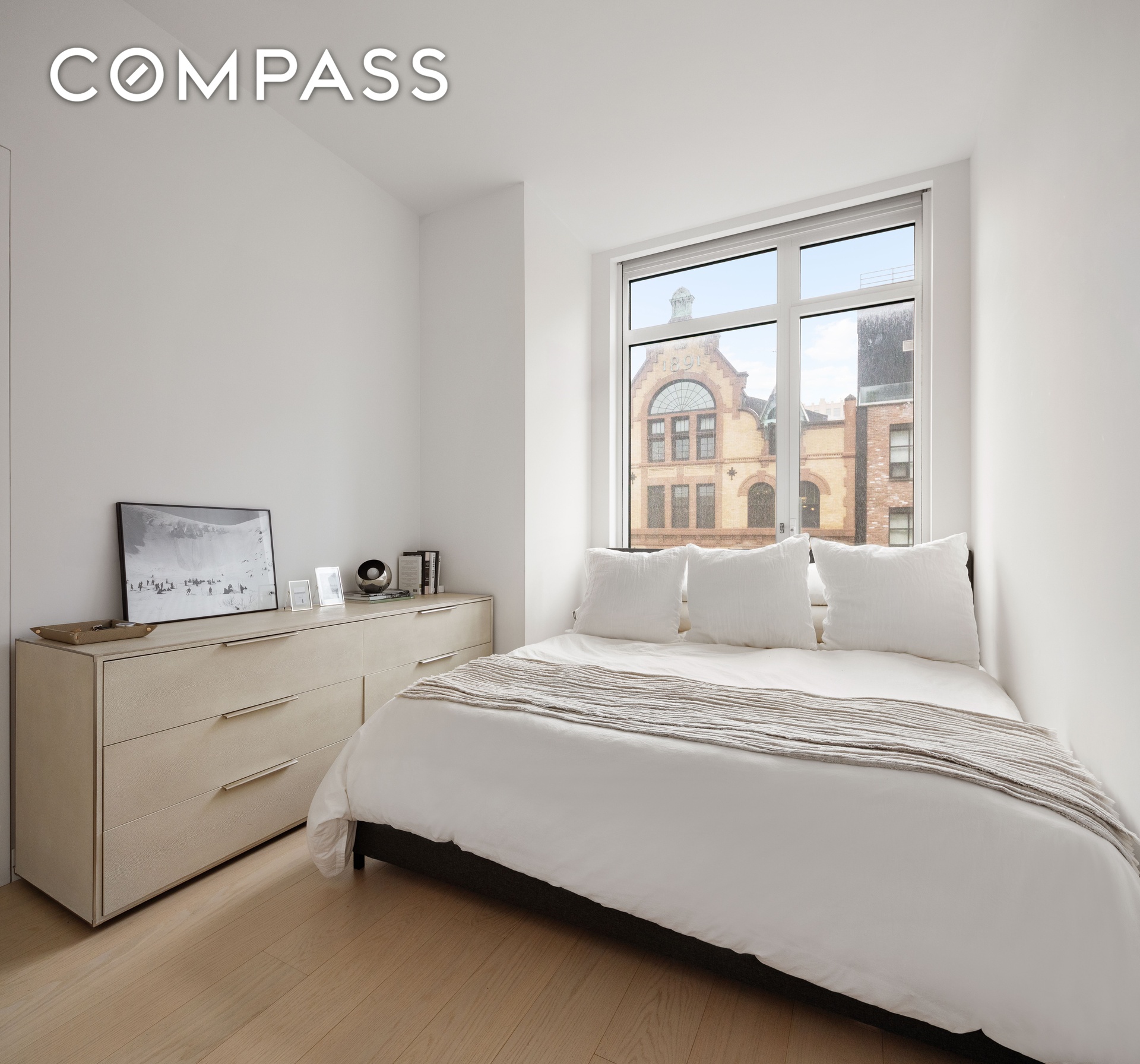 Residence 617 at 450 Washington Street is a sun-filled one-bedroom home featuring customized California Closet build-outs in both primary bedroom closets, automatic blinds, and blackout shades in the bedroom and main living area—perfectly balancing style and functionality. This residence is located on the sixth floor, which offers higher ceilings than other floors in the building, adding a sense of volume and openness to the space. The home enjoys picturesque Tribeca views overlooking historic Washington Street, charming cobblestone streets, and leafy treetops.