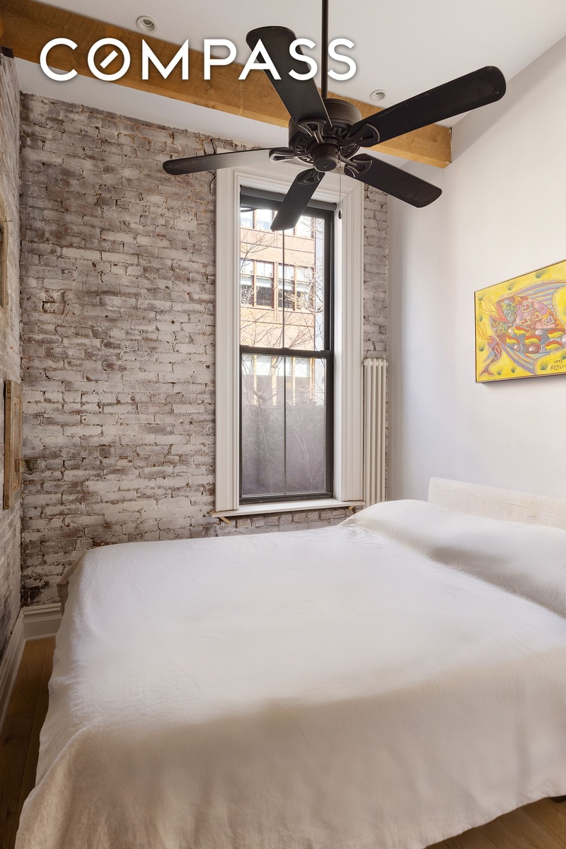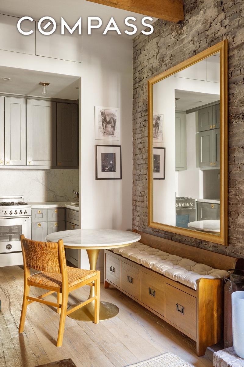 Enter this boutique-scaled, pre-war building from the quiet, tree-lined street via an outstanding tech-based virtual doorman. Upon entering the apartment, you are immediately struck by the rich hardwood floors that gleam in the light under expansive 10-foot ceilings, with exposed beams and a wall of exposed brick that accent the focal point: a working wood-burning fireplace. The kitchen features custom cabinetry, marble counters, a Fisher & Paykel dishwasher, a Bertazzoni range, a Sub-Zero refrigerator, and a microwave. A hallway leads to the bedroom and renovated bathroom, enhanced by numerous closets