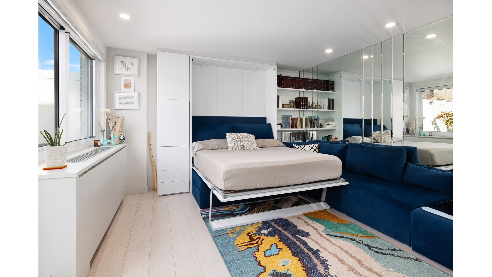 This special residence offers studio-living like no other. The chic living area features an L-shaped, bespoke, Imperial blue-velvet sofa built-in, that effortlessly transforms into a queen-sized bed. You'll enjoy cozying-up in this inviting room, whether day or night, while taking in the views from the wall of windows. Seamlessly transitioning the living space into the kitchen is a storage-filled, quartz topped island that functions as both a dining table and chef's prep space. The sleek and polished kitchen offers open shelving, stainless appliances (including a dishwasher), and more hand-crafted cabinetry.