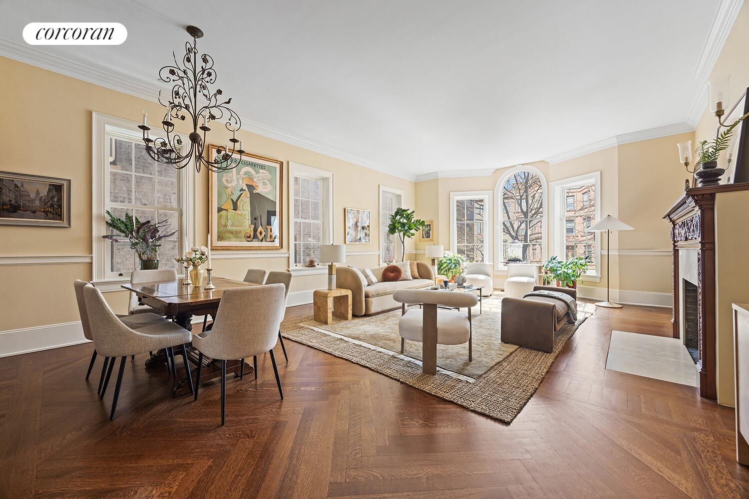 Enter through a shared vestibule into a home that feels open and well-proportioned from the start. Upstairs, the owner's triplex begins with a parlor floor where the proportions are stunning. High ceilings, richly stained white oak floors in herringbone, and magnificent oversized triple windows overlooking Carroll Street give the front living room an airy, elegant presence. A carved mahogany mantel anchors the space, while a built-in breakfront and generous dining area create a floor that feels suited to both everyday life and large-scale entertaining.
