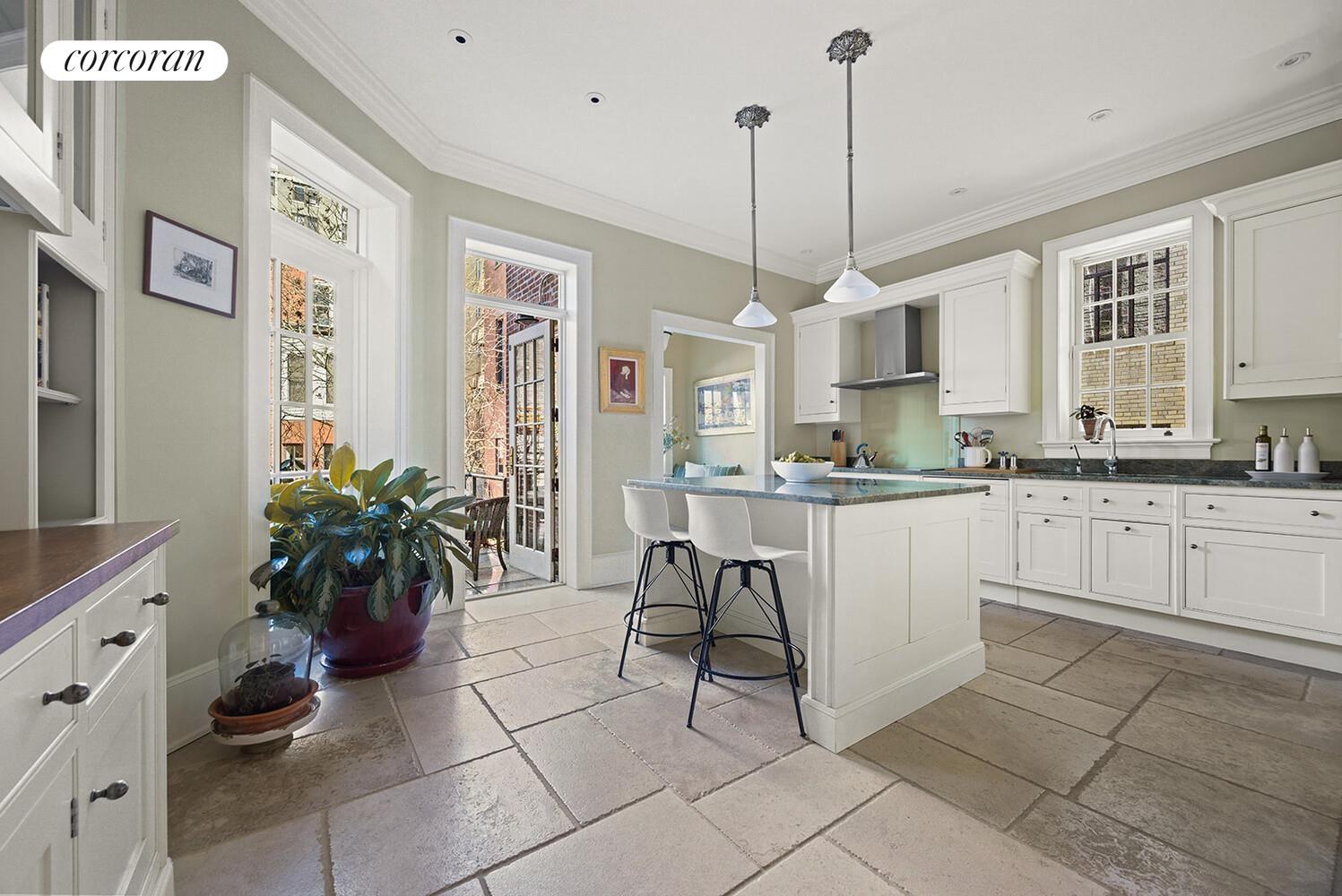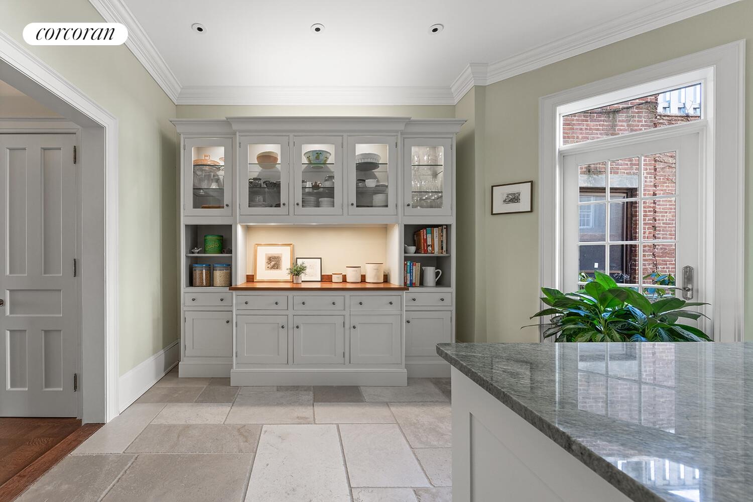 At the rear is a beautifully designed eat-in kitchen featuring Smallbone cabinetry, Costa Esmeralda granite and solid walnut countertops, French limestone floors, a large center island, Sub-Zero refrigeration, and Miele appliances including an induction cooktop. A built-in banquet creates a cozy breakfast nook and looks out to the garden. A door opens onto a steel-and-glass deck whose translucent glass floor allows light to cascade down to the garden below. A powder room completes this floor.