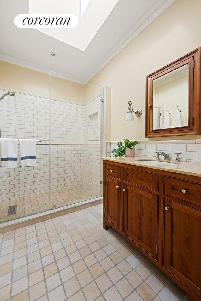 The level above is devoted to two exceptional bedrooms, including a large primary suite overlooking the garden. This quiet retreat features multiple closets, including a windowed walk-in closet, and a bathroom with double sinks and refined finishes. A second large bedroom on this floor has its own ensuite bathroom with clawfoot tub and marble floor. The windowed hallway keeps the space feeling open and bright.