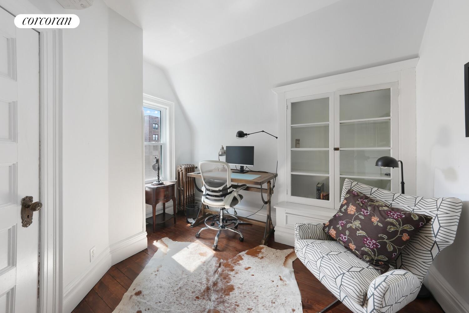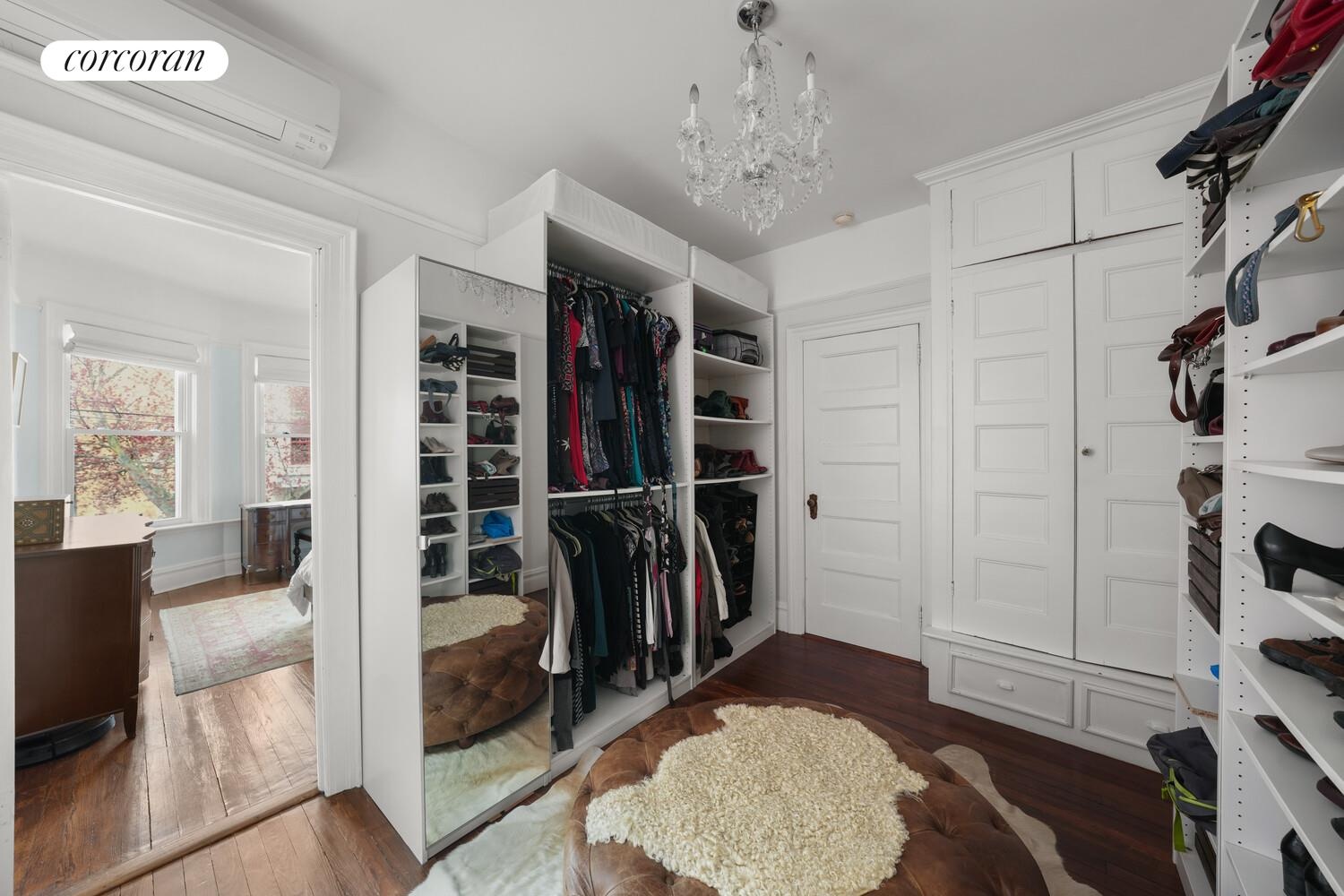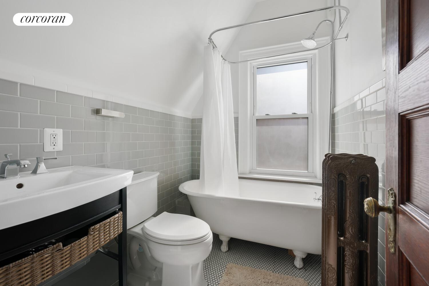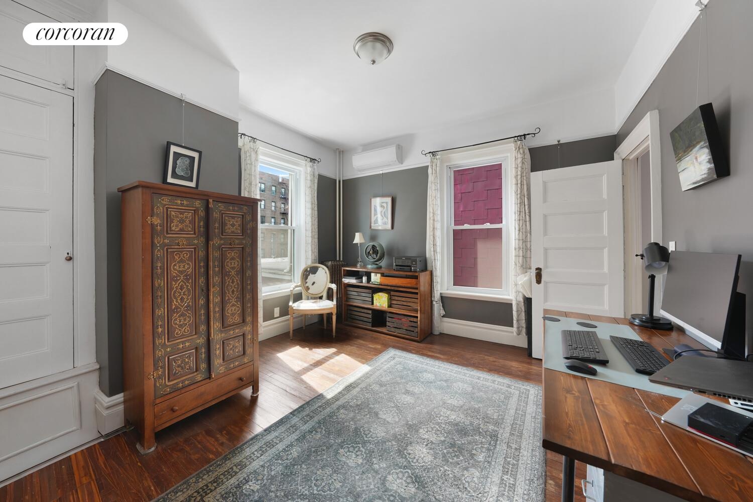 The home is configured as a highly functional five-bedroom residence across two upper floors. The second floor features an oversized primary bedroom, a secondary bedroom, a full bathroom, and a dedicated walk-in closet that can easily serve as another bedroom or home office. The third floor offers three additional well-proportioned bedrooms and a second full bathroom. The bathrooms have been refreshed with restored fixtures, maintaining the home's period character.
