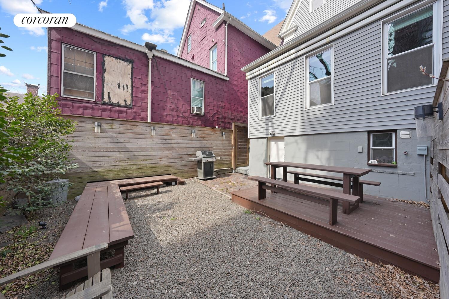 A large unfinished basement serves as a blank canvas ready for a home gym, recreation room, or additional storage. The footprint is there; the vision is yours. The fully enclosed backyard is designed for entertaining, featuring custom horizontal wood fencing, a wooden deck, built-in bench seating, a low-maintenance pea gravel finish, and integrated wired lighting, a complete outdoor remodel executed with care.