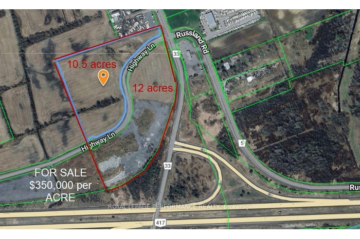 Vars exit, approved subdivision parcel for sale 12.3 acres, zoned Highway Commercial. Ideal location for any distribution center wishing to relocate to a central location in proximity to Ottawa, Montreal, Cornwall and Hawkesbury. If you require a larger parcel, an additional 10.3 acres are available.