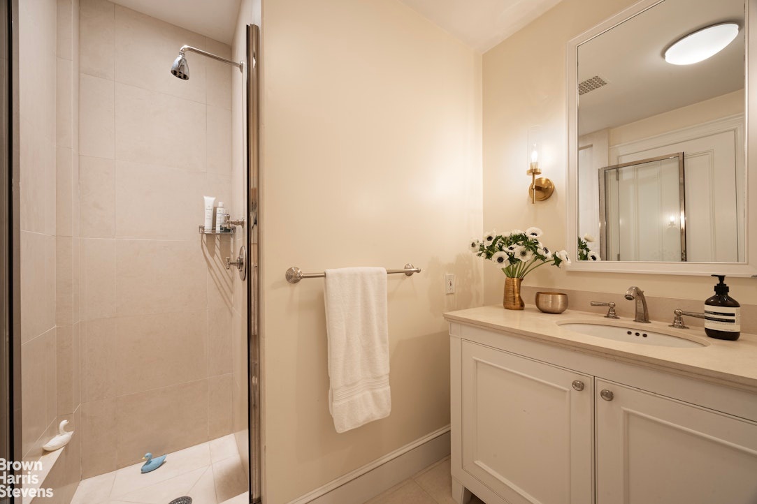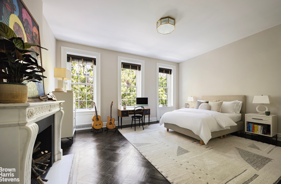 The primary bedroom is a sanctuary of natural light, featuring three large south-facing windows and a striking 19th-century working fireplace. The luxurious en-suite includes a spacious dressing room with custom built-ins, leading to a marble-appointed bathroom with double vanities, soaking tub, and oversized dual-head shower. A versatile north-facing room, currently utilized as an office, completes this private floor.