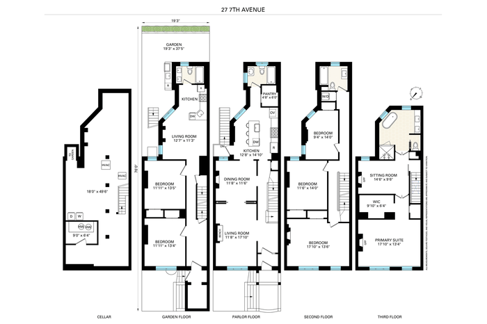 The upper triplex is a showcase of preserved craftsmanship and refined details. Original millwork, plaster moldings, generous ceiling heights, and a stunning pier mirror anchor the elegant parlor level. A formal dining room with a unique decorative marble and brass fireplace flows into the sandblasted chef’s kitchen, outfitted with Calacatta Gold marble, a six-burner Wolf range with commercial-grade hood, paneled Sub-Zero refrigerator, and a generous walk-in pantry. Just beyond, a beautifully landscaped bluestone garden creates a seamless indoor-outdoor living experience, complete with a built-in grill, refrigerator, sink, and planting beds.