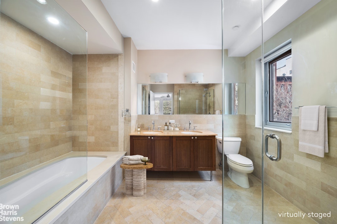 The primary bedroom suite enjoys the privacy of a spa-like windowed bath with double sinks, a soaking tub, and a steam shower. For enhanced privacy, both bedrooms are tucked away from the living area and feature direct access to a private outdoor terrace facing a peaceful garden. Plenty of closet space, your own in-unit washer & dryer, and a private storage space in the basement! Perfect move-in condition.