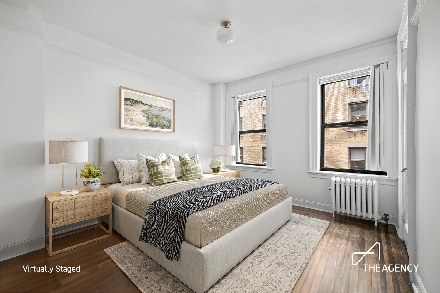 Thoughtfully laid out, the apartment features gracious proportions throughout, including a windowed kitchen. The expansive living and dining areas are perfect for entertaining or quiet evenings at home, while the generously sized bedrooms promise a tranquil retreat from the city's rhythm. Original architectural details, including hardwood floors, high ceilings, and crown moldings, add a sense of history and understated elegance.