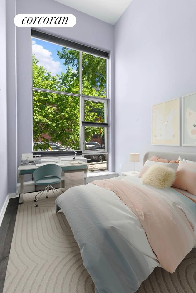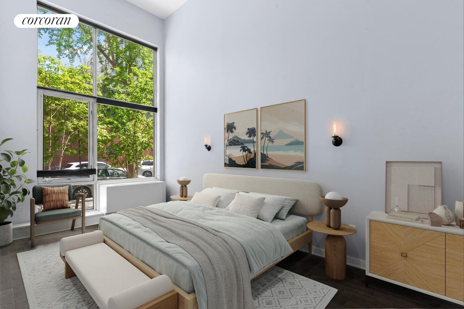 Residence 1H at The Foundry Condominium (2-40 51st Avenue) is a standout two-bedroom, two-bathroom home with dramatic 16'6" ceilings that create an immediate sense of scale, light, and flexibility for living and entertaining.