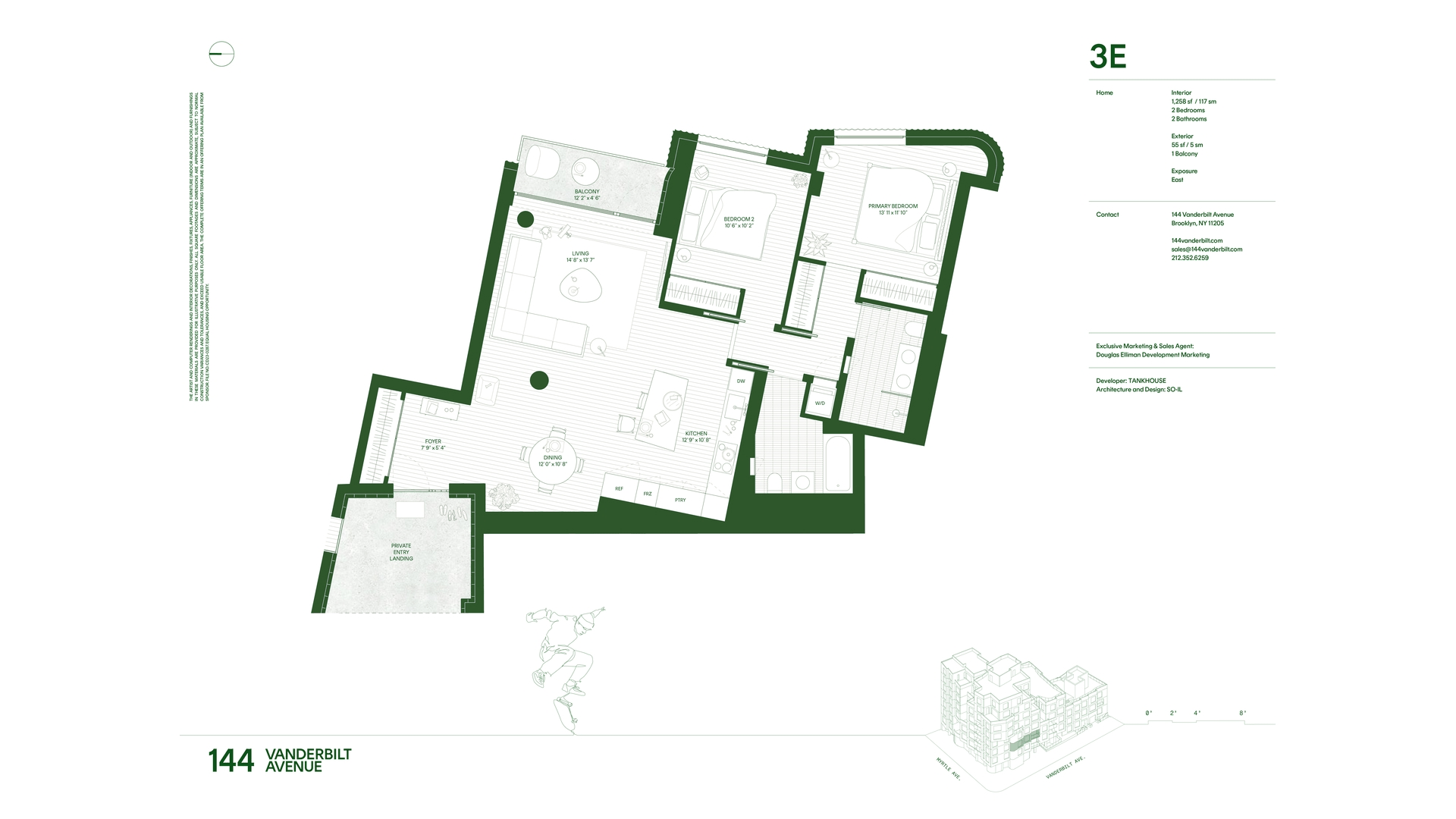 Residence 3E comprises 1,258 SF, offering two bedrooms, two bathrooms, East exposures and a 55 SF private terrace. Upon arrival through a separate entry landing, white oak floors, exposed concrete ceilings and natural lighting set the tone for modern, design-forward living.