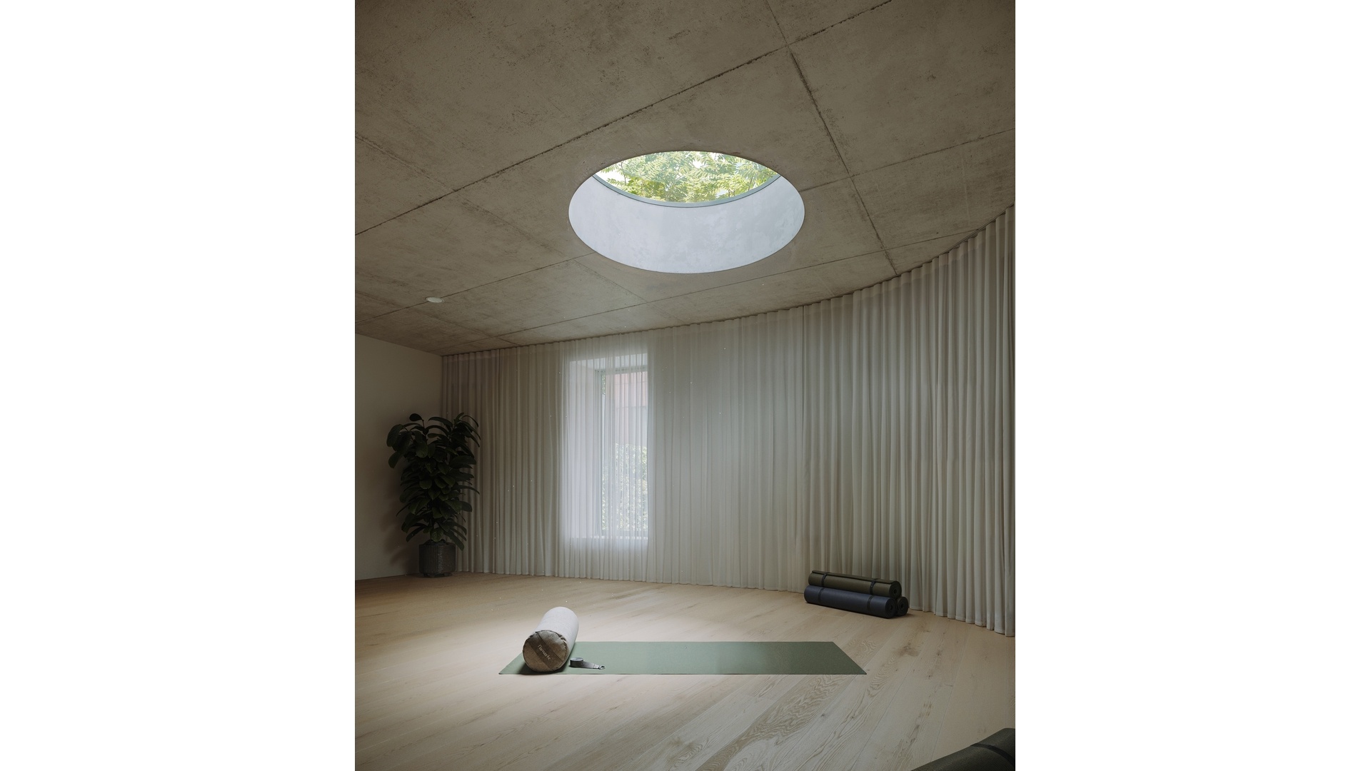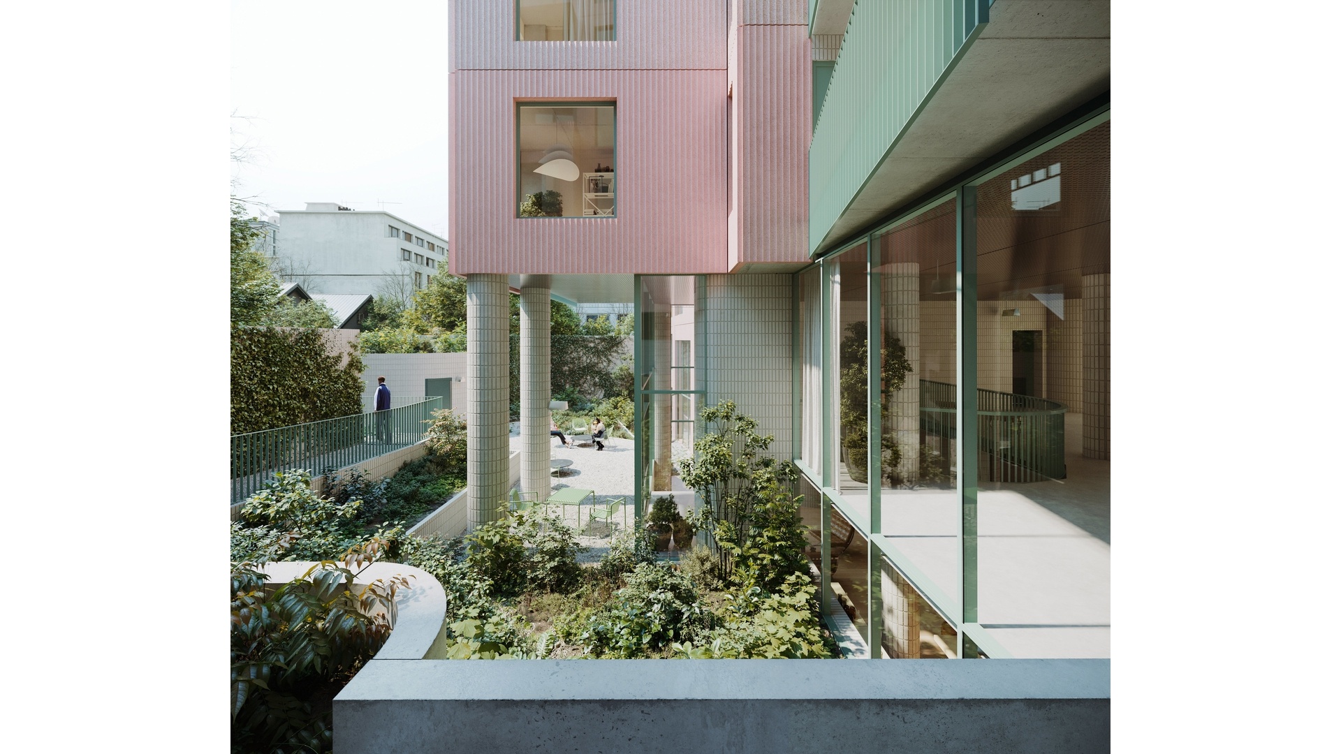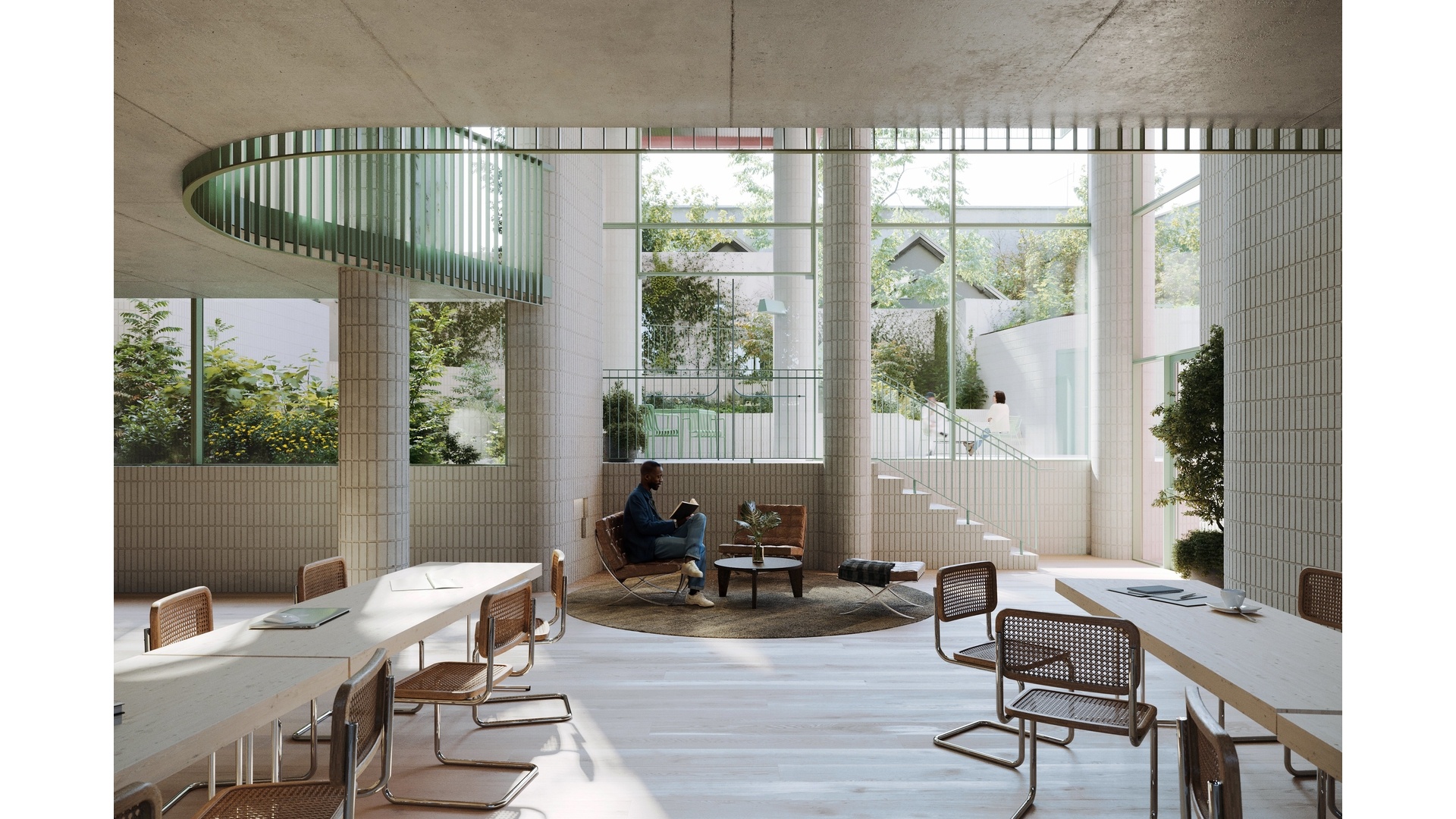 144 Vanderbilt uniquely offers over 11,000 SF of private amenities. Throughout the Entry and Lobby areas, varied ceiling heights, and fully glazed walls create a sequence of compression and expansion, which adds to the building's drama and intrigue. Towards the back, a meandering route leads down to the Cascading Secret Garden. The garden offers multiple seating areas that provide places for solitude and gathering. Hidden in the garden, The Studio is the ideal space for yoga, or meditation. On the other side is the double-height Coworking & Residents" Lounge, offering 1,290 SF of space to work, lounge and receive guests, as well as access to the Game Room. The Sunken Garden sits at the heart of these amenities, bringing in natural light and connecting views from the Coworking & Residents' Lounge to the state-of-the-art Fitness Center and the Children's Playroom across the greenery.