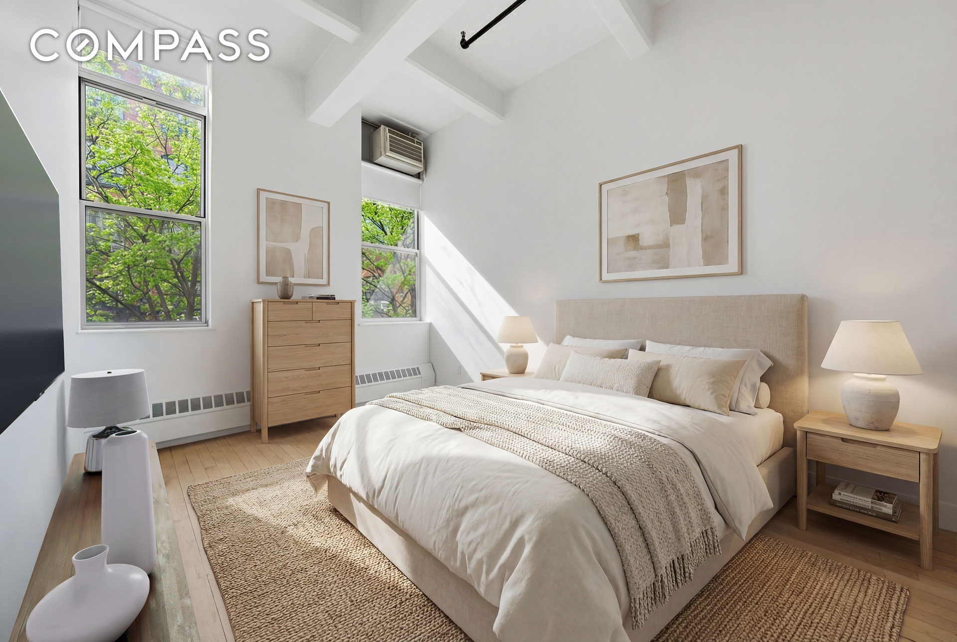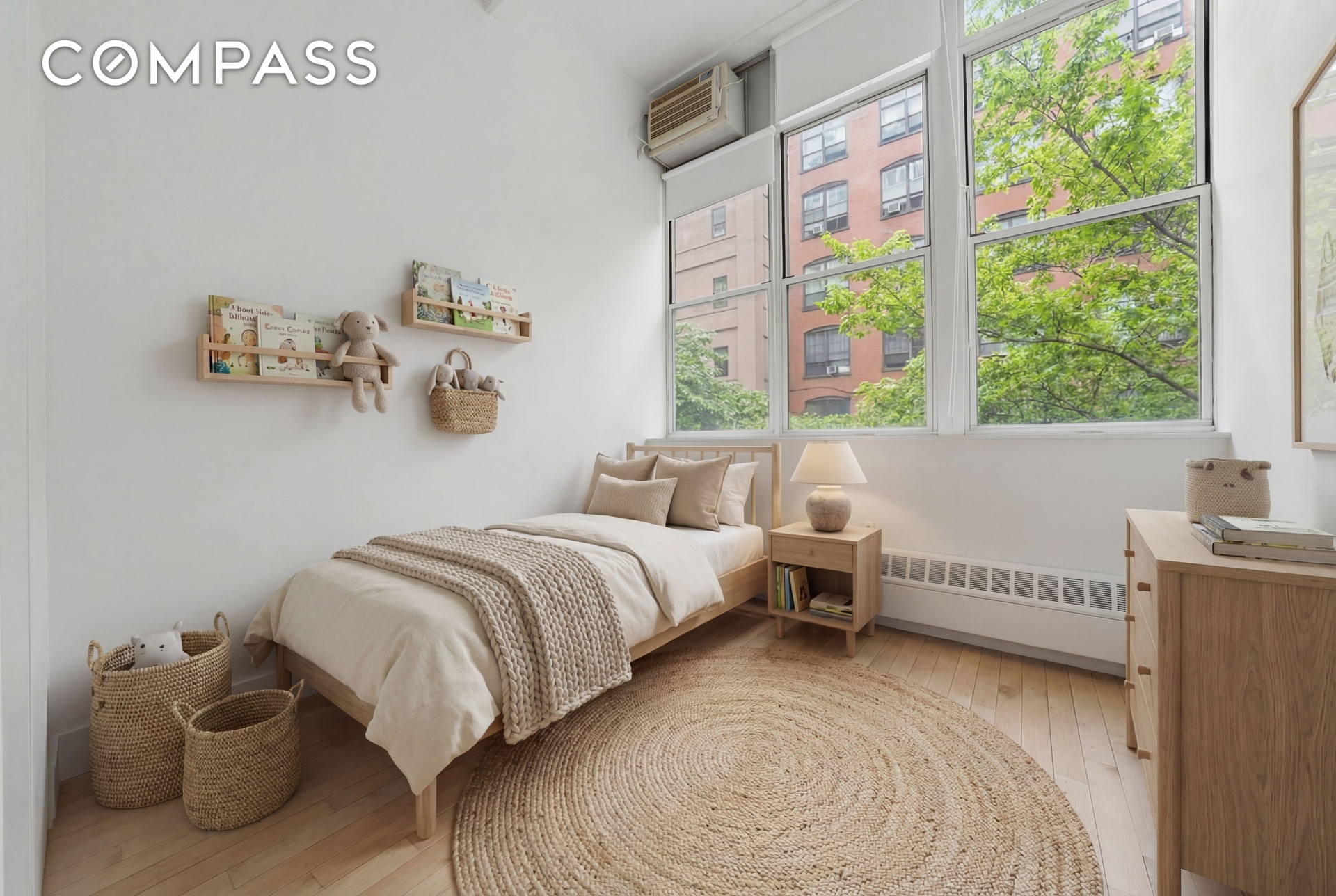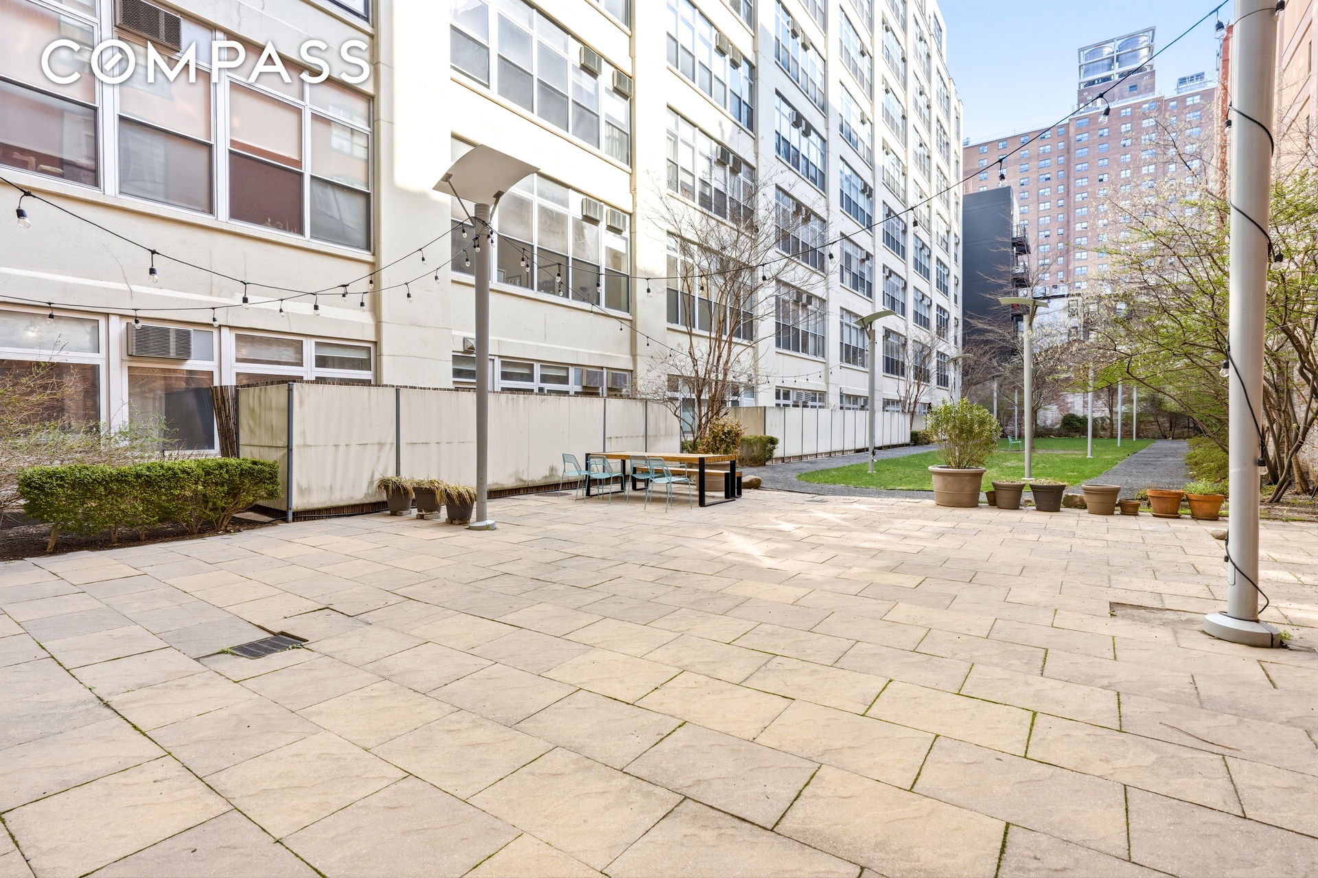 overlooking the building’s peaceful courtyard, the room feels bright and airy while still private.