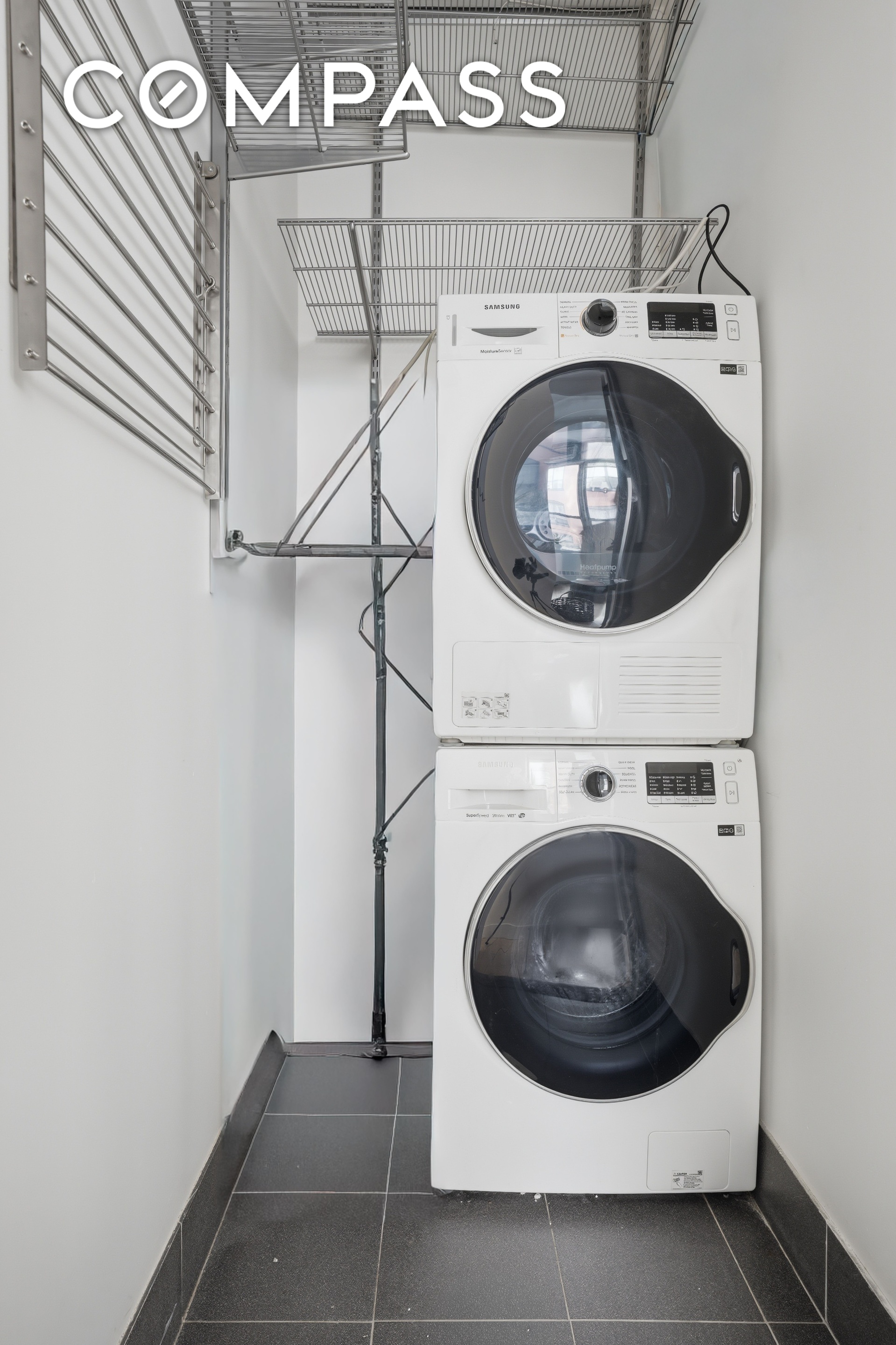a dedicated laundry closet with a washer and dryer keeps daily essentials tucked away.