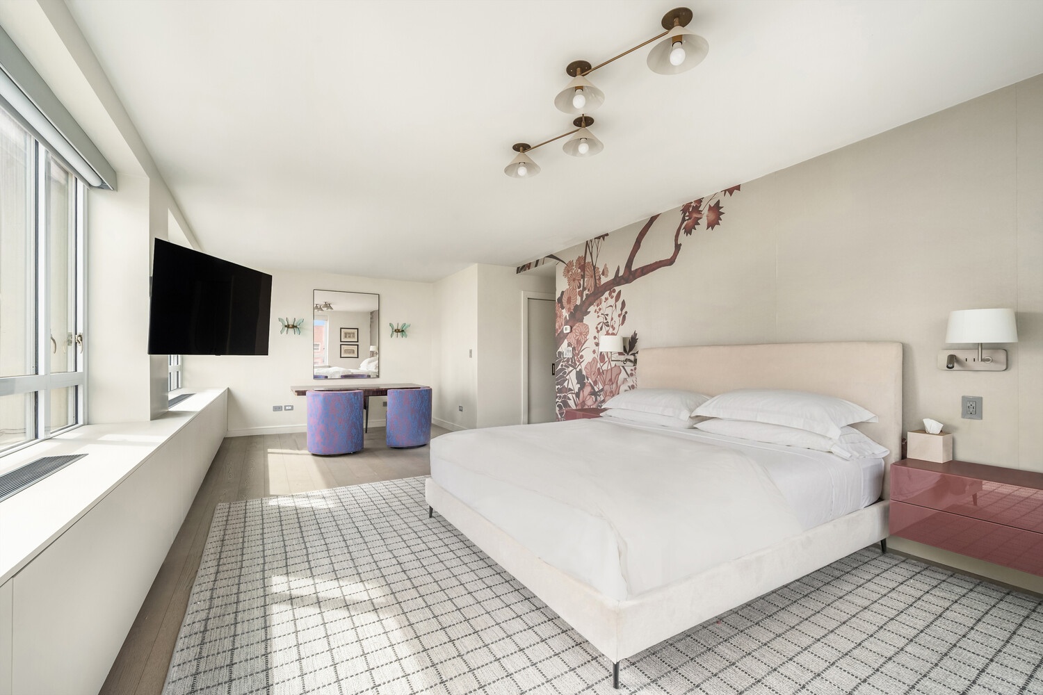 Lighting and technology have been carefully curated, with recessed LED lighting, custom dining area illumination, and dimmer switches throughout. The apartment is prewired for high-speed internet and home office connectivity. Oversized, soundproof, energy-efficient windows flood the home with natural light, while automated window treatments allow for effortless, remote-controlled operation.