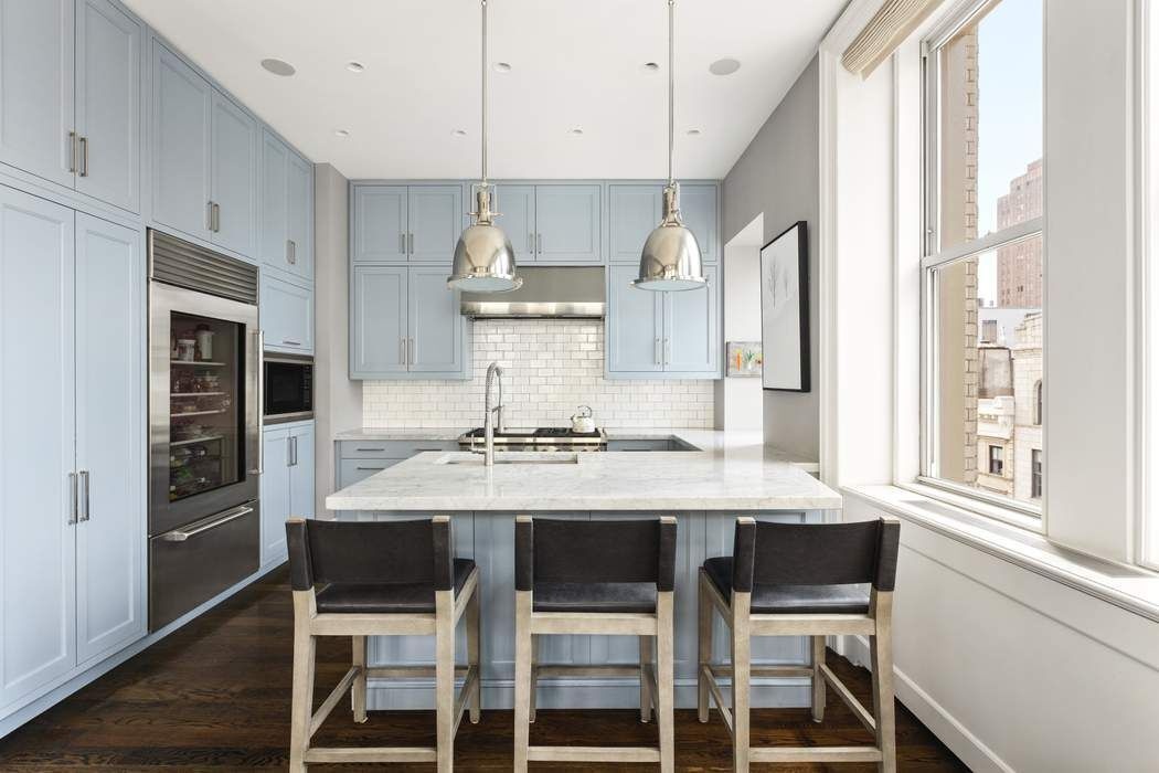 The renovation is pristine and carefully considered. A chef’s kitchen anchors the living space, equipped with a vented six burner Wolf range with griddle, Sub Zero refrigerator, Miele dishwasher and microwave, marble countertops, a deep double sink, and generous pantry storage. The finishes, hardware, and overall attention to detail are thoughtful and well executed throughout.