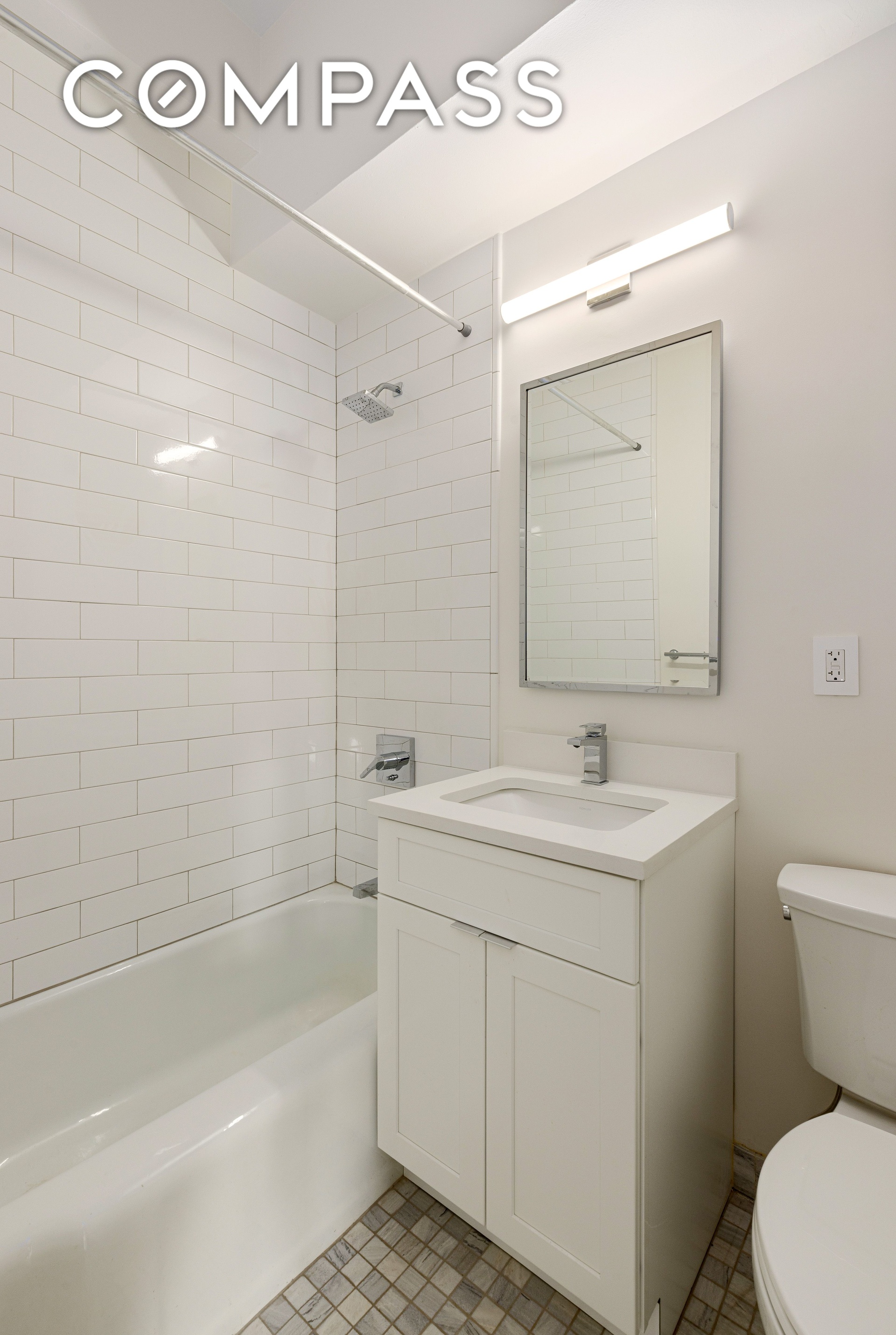 The bathroom is renovated with all new fixtures, subway tile walls and marble floor.