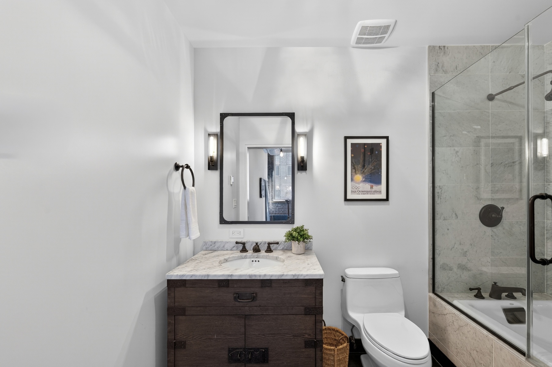 The current layout offers two expansive bedrooms and a home office, each bedroom with its own en suite bath, with the scale to easily create a true three bedroom home. A private north facing terrace extends directly from the living space, offering a rare moment of outdoor calm and an effortless extension of the interior. There is also a sense of ease built into the home, with central air, an oversized laundry room, and a substantial private storage unit that transfers with the residence.