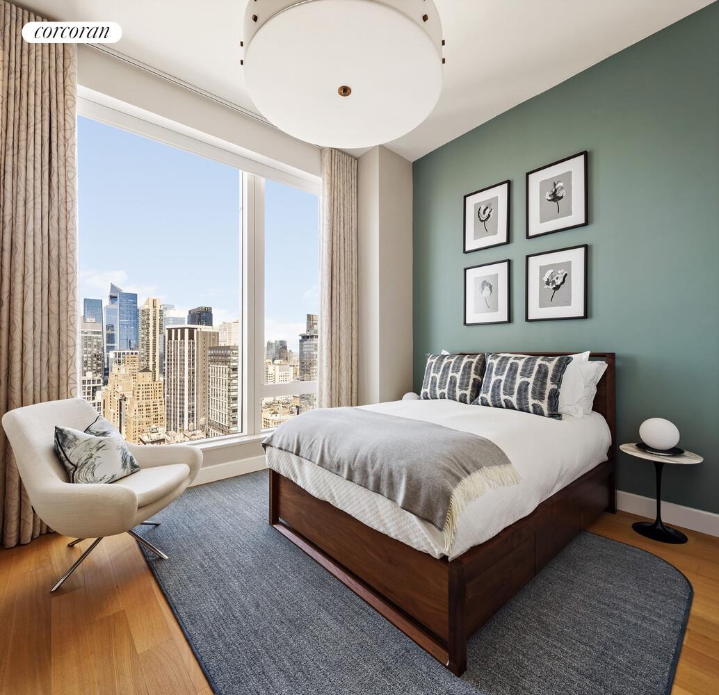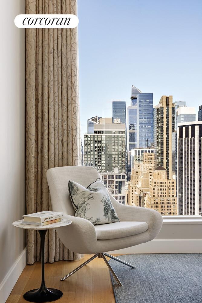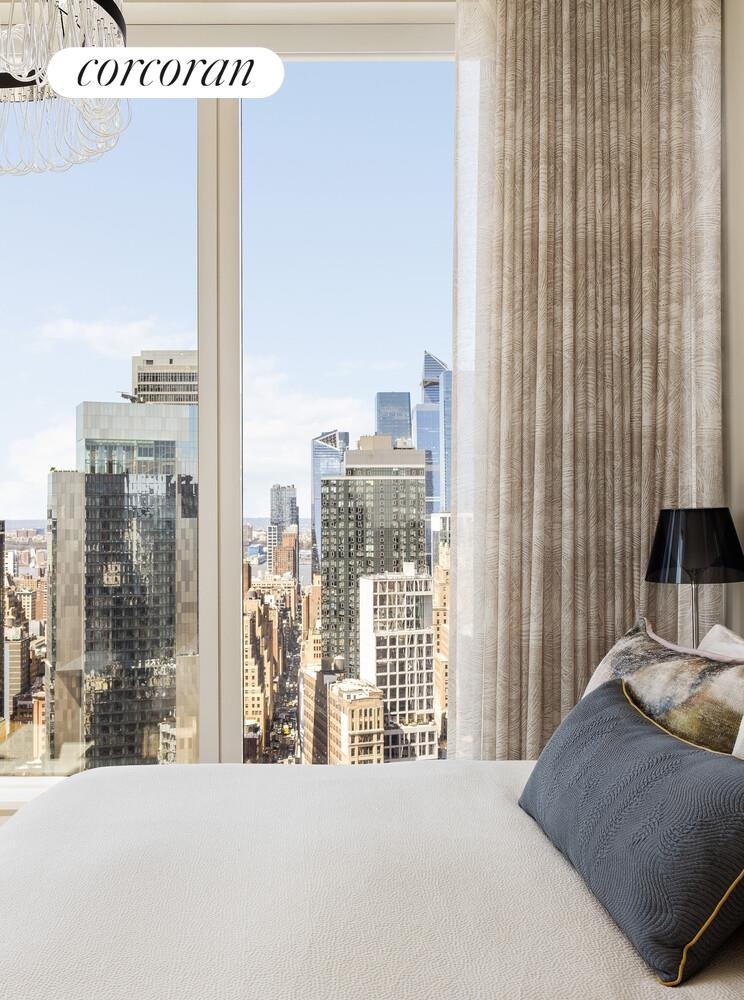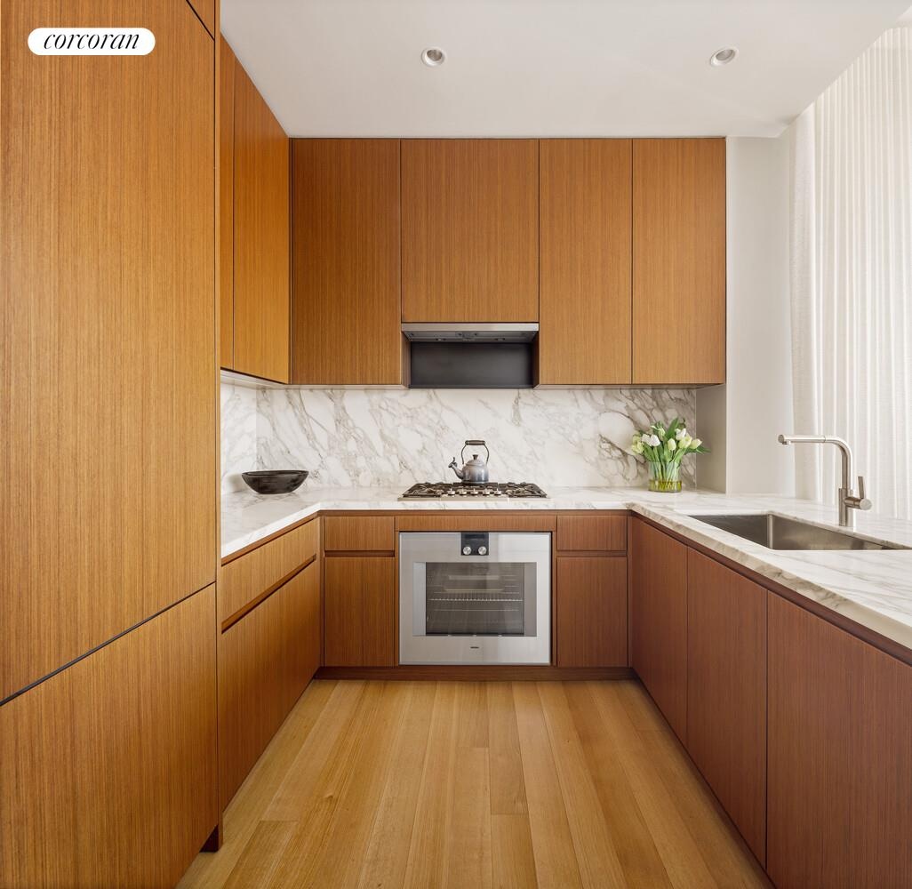 Beginning with a gracious entry foyer that opens into a sun-filled living and dining area, with 11' ceilings and framed by oversized windows with open southern and western exposures and an iconic view of the Empire State Building.The open, vented kitchen blends form and function, with custom rift-cut cabinetry by Gachot, a Calacatta Borghini marble waterfall island and backsplash, and a full suite of Gaggenau appliances, including a cooktop, combi-steam oven, refrigerator, and garbage disposal. Five-inch wide-plank white oak floors and nine-foot solid walnut doors add warmth and sophistication throughout.