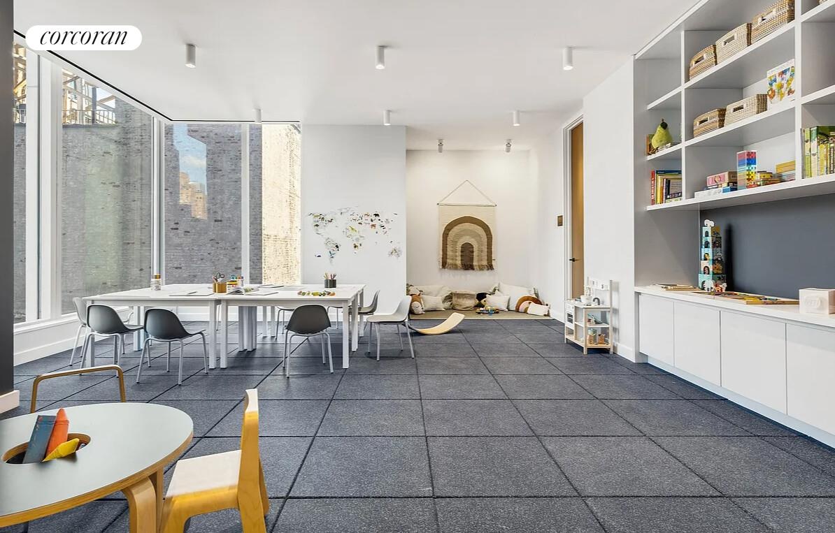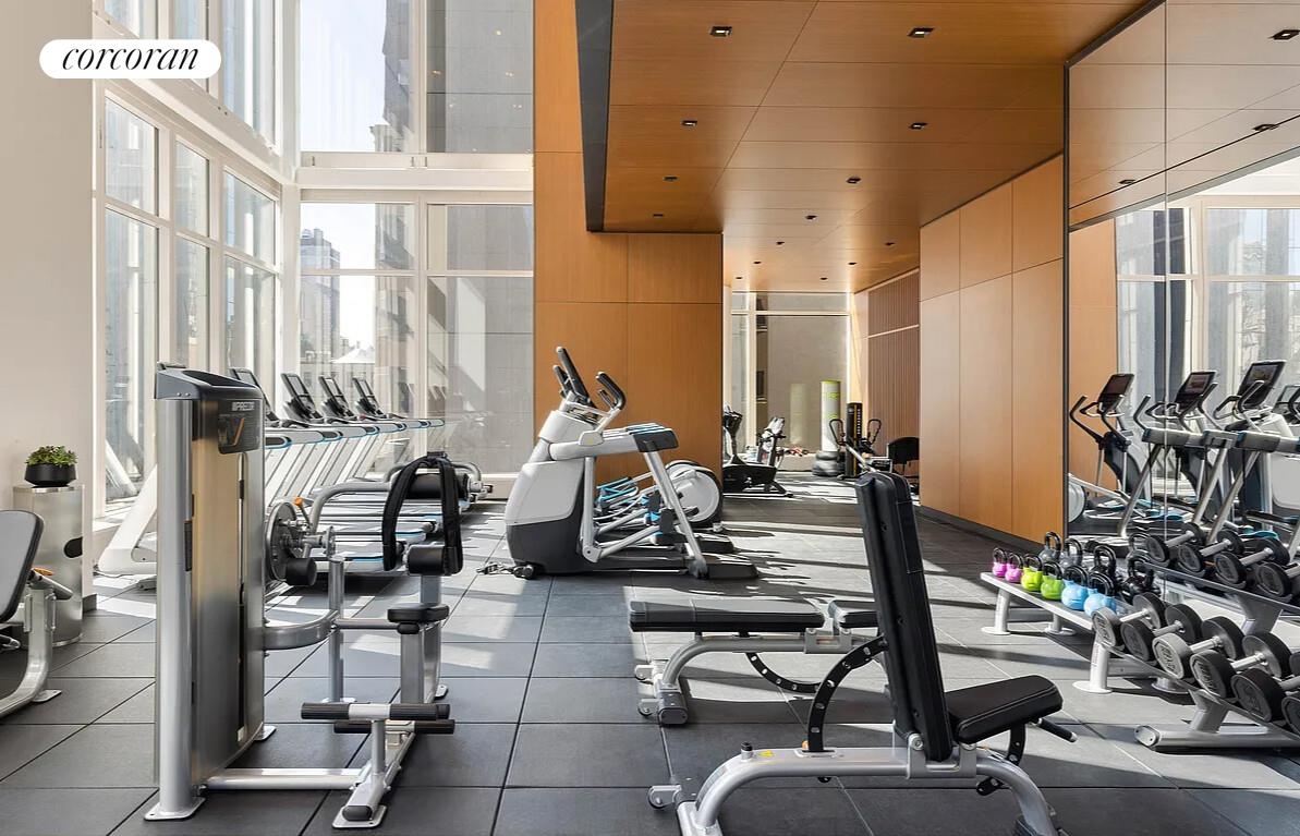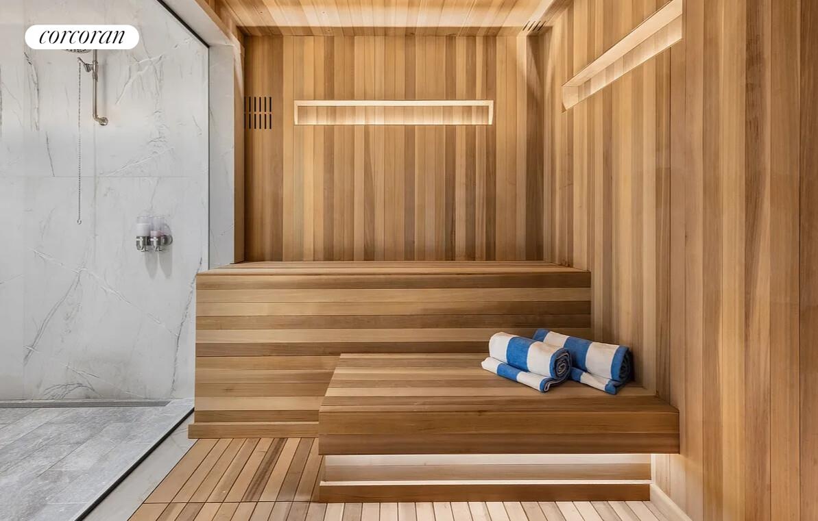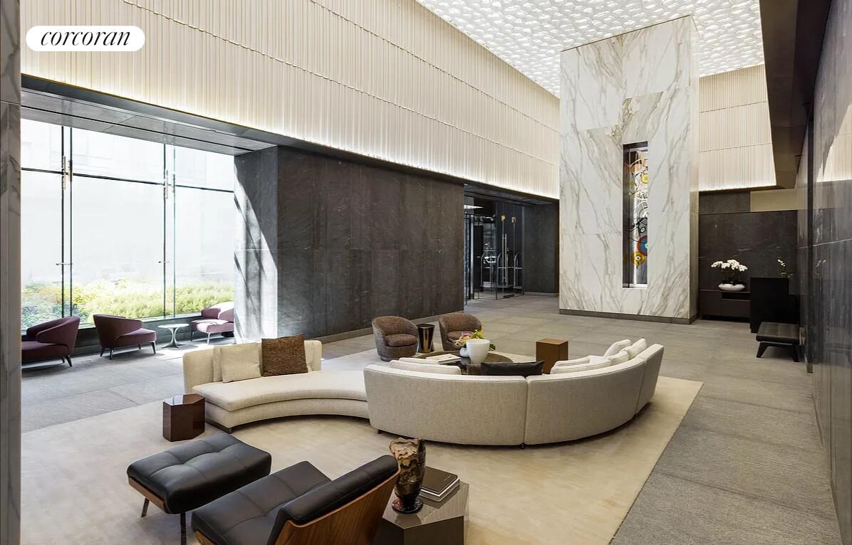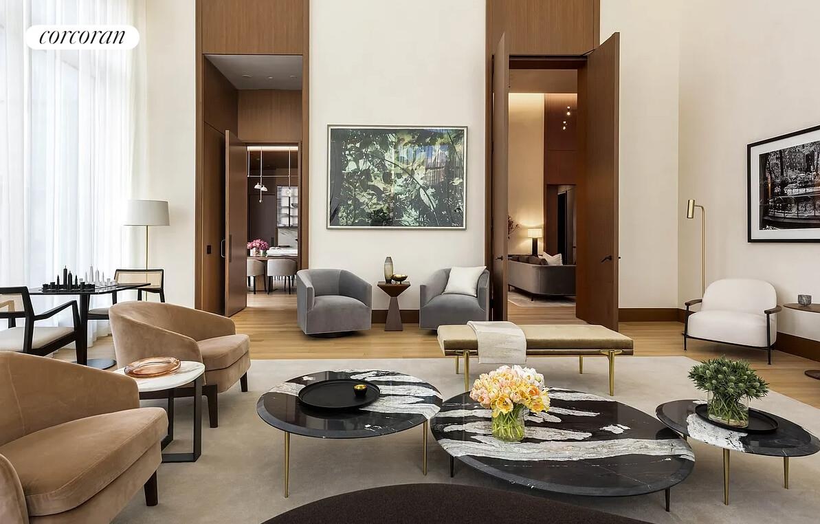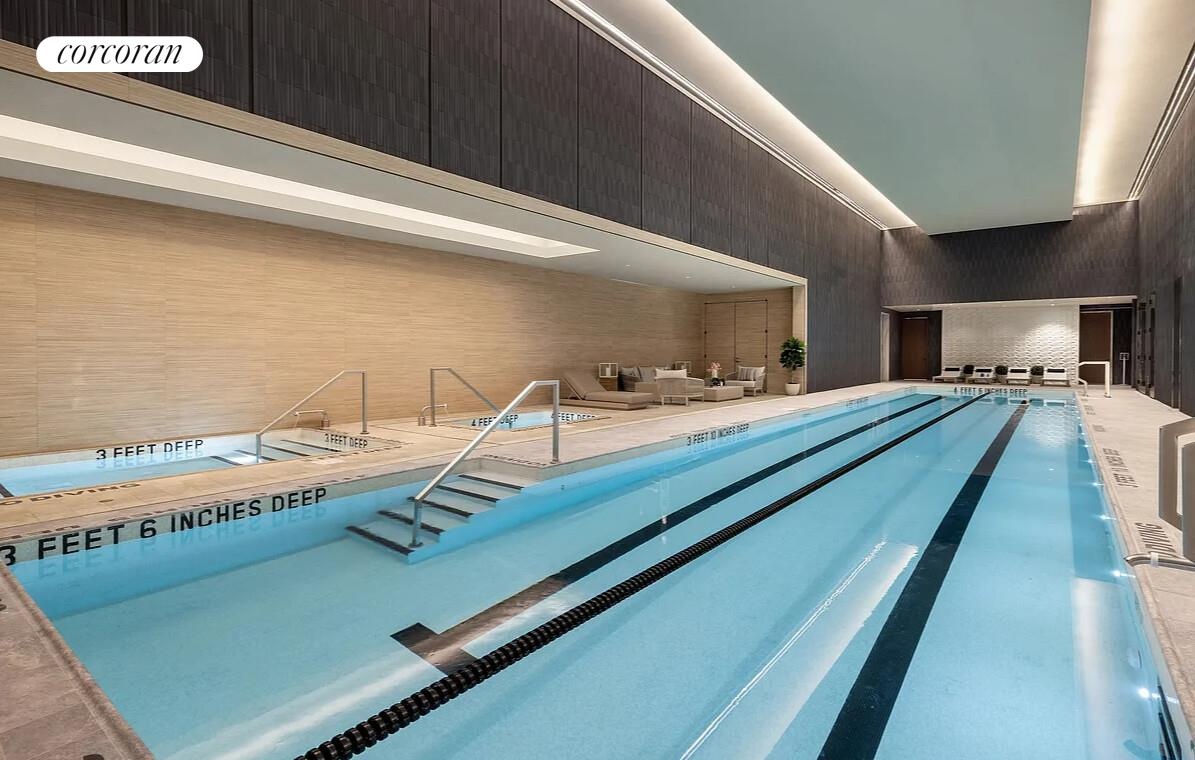 Residents enjoy over 30,000 square feet of amenities, including a double-height attended lobby and a full-service wellness suite with a 75-foot lap pool, cold plunge, hot tub, steam room, sauna, and treatment room. Additional offerings include a landscaped roof garden, private lounge and bar, formal dining room with catering kitchen, conference and reading rooms, a fully equipped fitness center with yoga studio, and a sports lounge with a golf simulator, billiards, and a children's playroom.