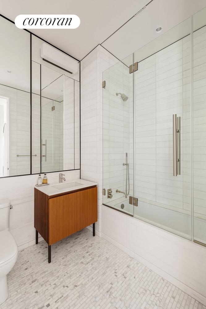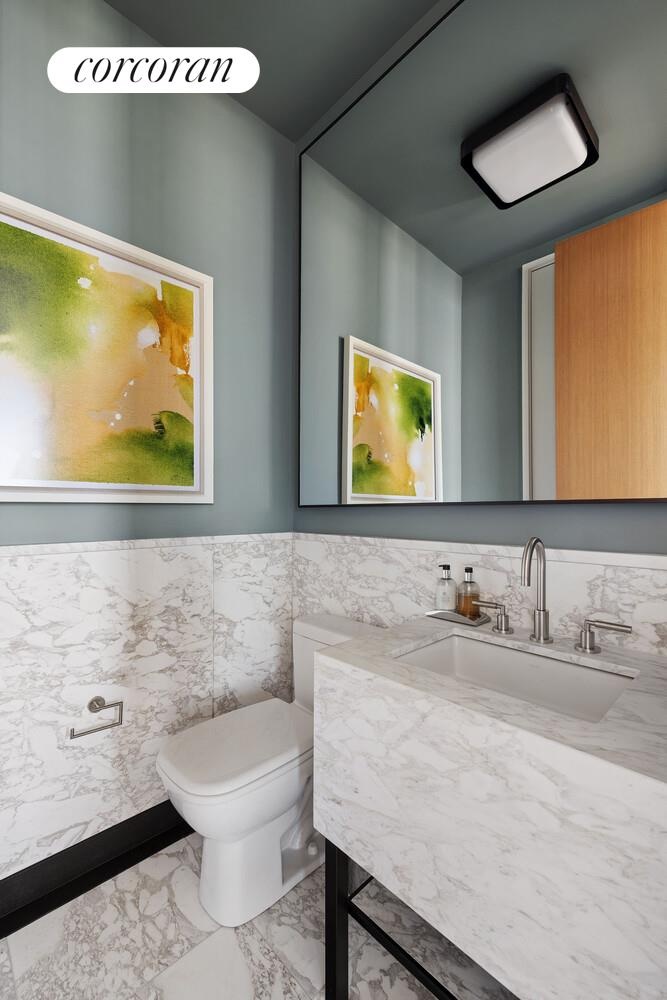 The second bedroom is generously sized and features its own en-suite bathroom along with a custom built-out closet, offering comfort and functionality for guests or everyday living. A powder room off the foyer is appointed with Calacatta Nuevo and Absolute Black marble, complemented by a custom vanity and Dornbracht fixtures.