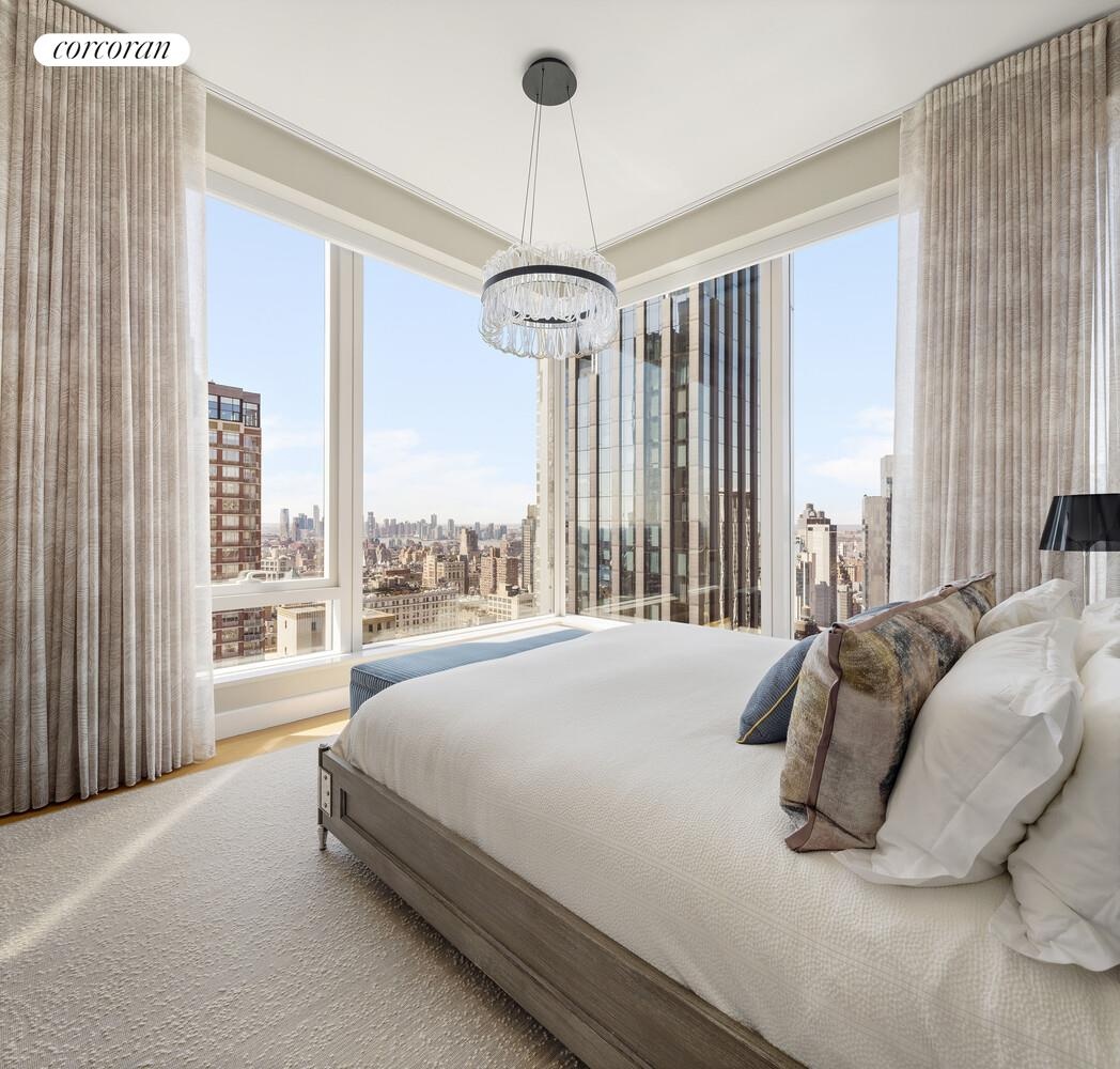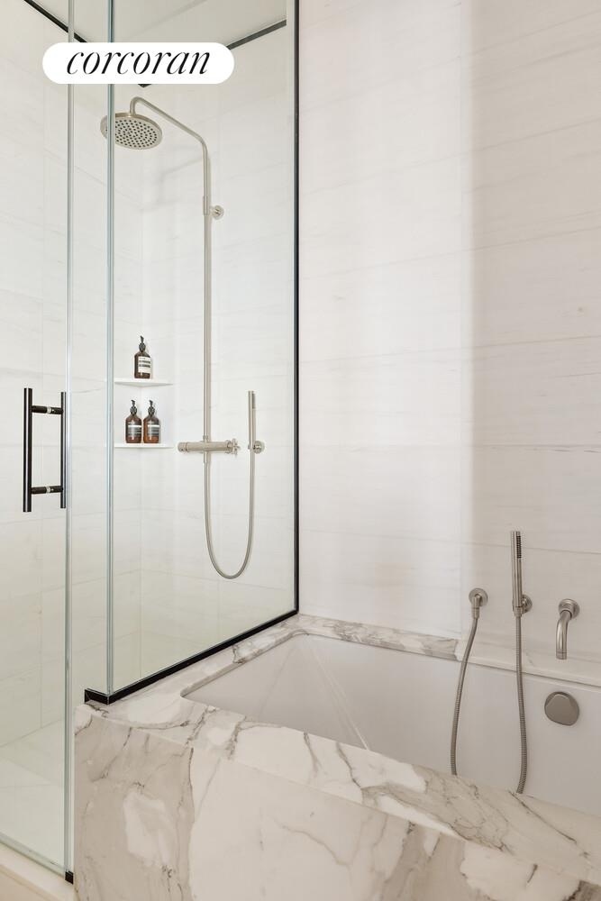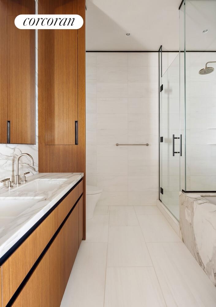 The corner primary bedroom suite, complete with a custom walk-in closet, is set apart from the living space by a private vestibule, offering both privacy and a sense of retreat. The en suite bath is finished in honed Bianco Dolomiti marble with radiant heated floors, and features a custom Gachot-designed vanity, platinum matte Dornbracht fixtures, a Kaldewei soaking tub, and a Toto toilet with integrated bidet.