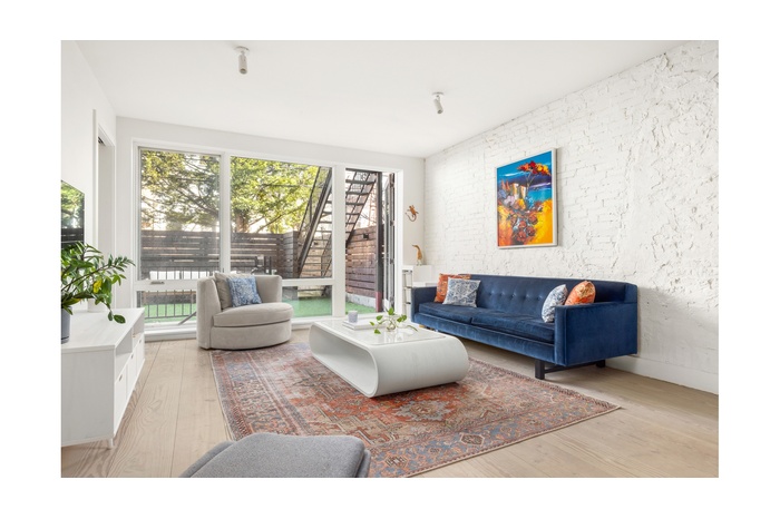 Upon entry, a gracious foyer welcomes you with elegant Clé tilework. The main hallway opens to a bright and airy living/dining area where wide plank white oak floors and exposed brick create a warm, yet modern aesthetic. The kitchen is both refined and highly functional, outfitted with custom cabinetry, a full suite of Fisher & Paykel appliances and Terrazzo countertops. Just off the kitchen, the dining area easily accommodates an oversized table for dinner gatherings. The living room leads directly to the private outdoor space, making this area well suited for everyday use and hosting alike. Heading outside, the backyard is the perfect area to enjoy the outdoors. With enough room for multiple sitting areas the backyard is a great place to host guests, dine al fresco, or simple quiet enjoyment.