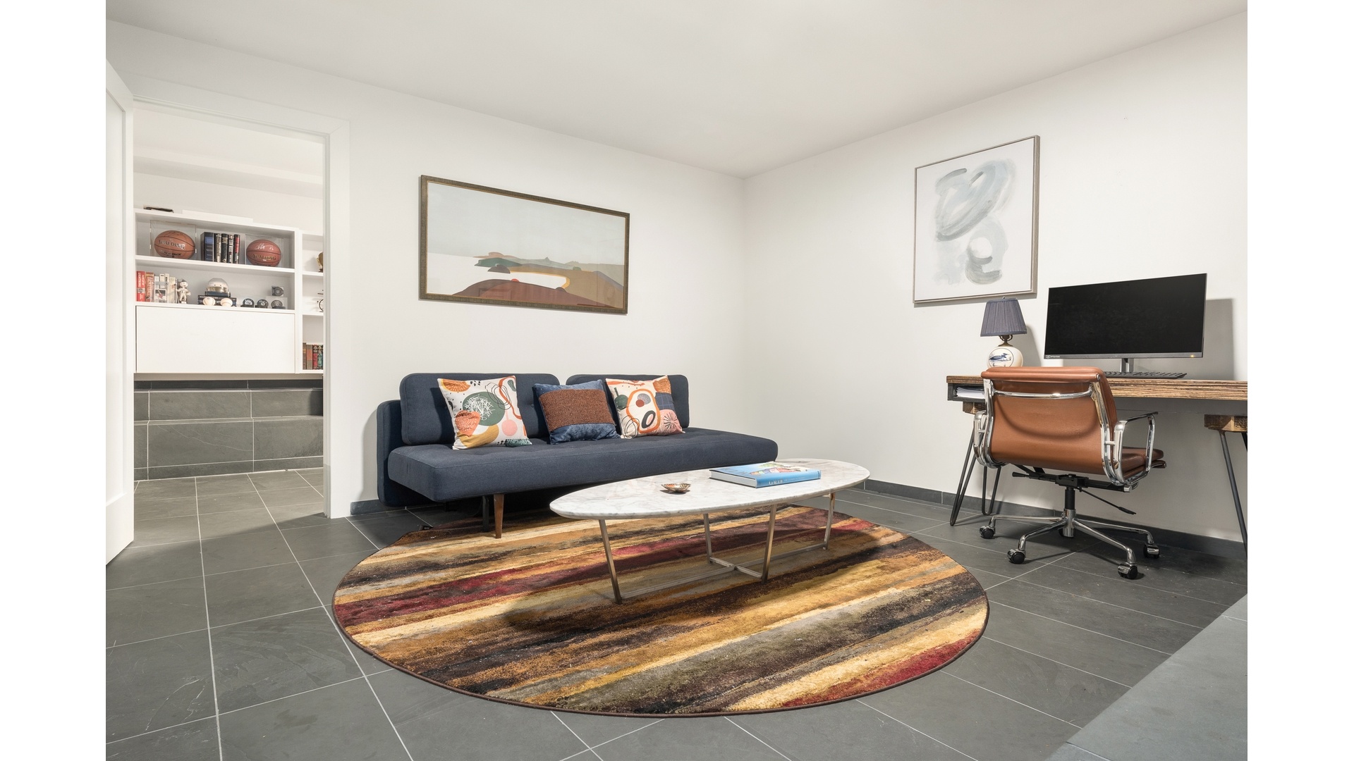 The main level is also home to the oversized primary suite. This bedroom has two south facing windows and comfortably accommodates a king-size bed. A spacious walk-through closet and beautifully appointed en-suite bathroom are accessed through the bedroom. The primary bathroom features a frameless glass shower, separate Duravit soaking tub enclosed in marble and floating Toto toilet. Complimented with beautiful Terrazzo floors and gorgeous Kohler brass fixtures, the bathroom feels timeless.