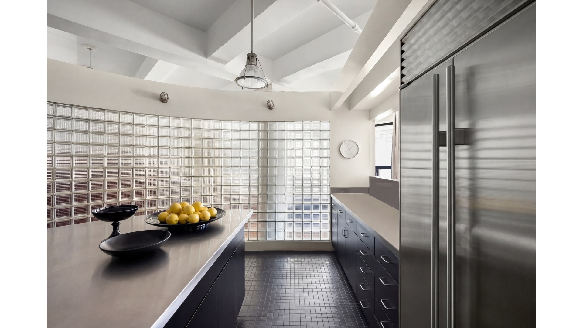 The open-concept floorplan is perfect for entertaining, with expansive living and dining areas elegantly separated by designer glassbrick cubes, blending function with style. The sleek chef's kitchen seamlessly integrates into the living space, offering both practicality and sophistication.
