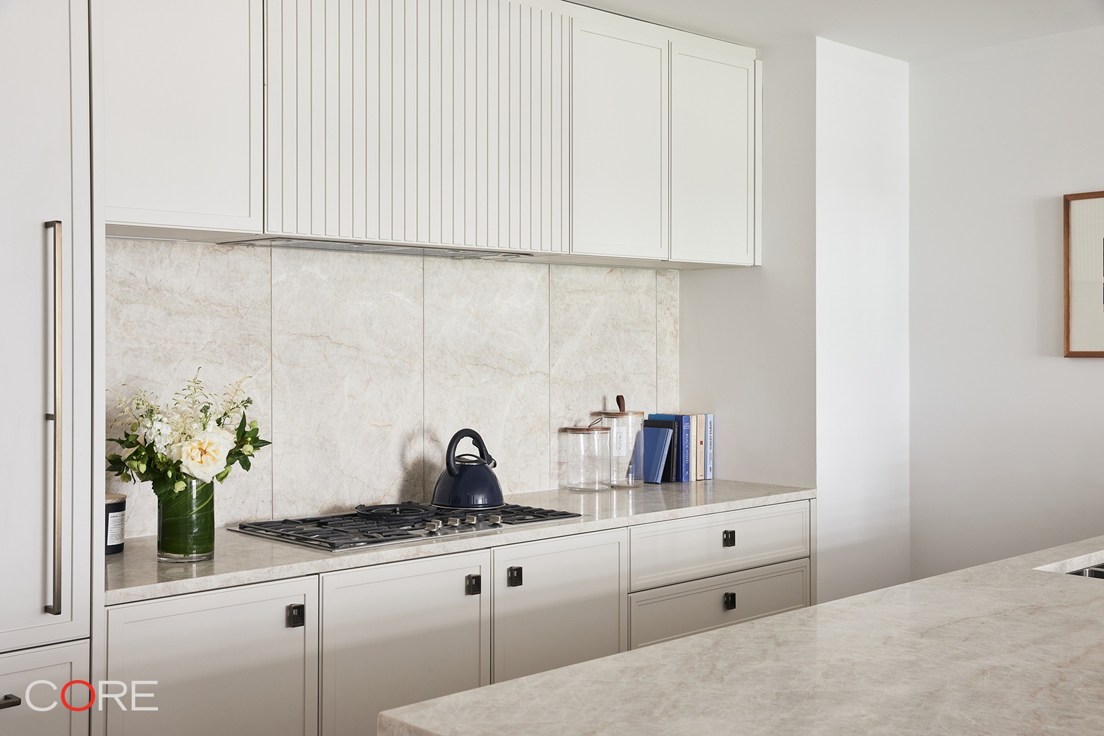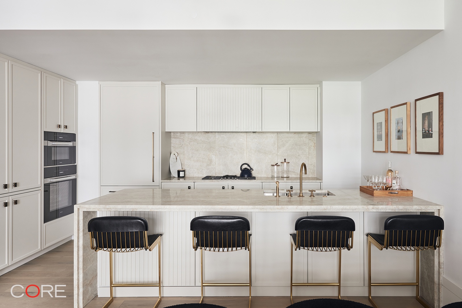 Residence 9D is a highly desired split three-bedroom with an expansive living and dining room. Immediately upon entering the home, you are greeted by a gracious gallery and foyer. The open kitchen and living room anchor the home. Custom-designed by Poliform in collaboration with ODA, the kitchen boasts warm matte lacquer cabinetry adorned with antique brass hardware from WaterWorks. The Taj Mahal quartzite countertop and backsplash exude elegance, while Miele integrated appliances offer both exquisite design and top-notch performance.