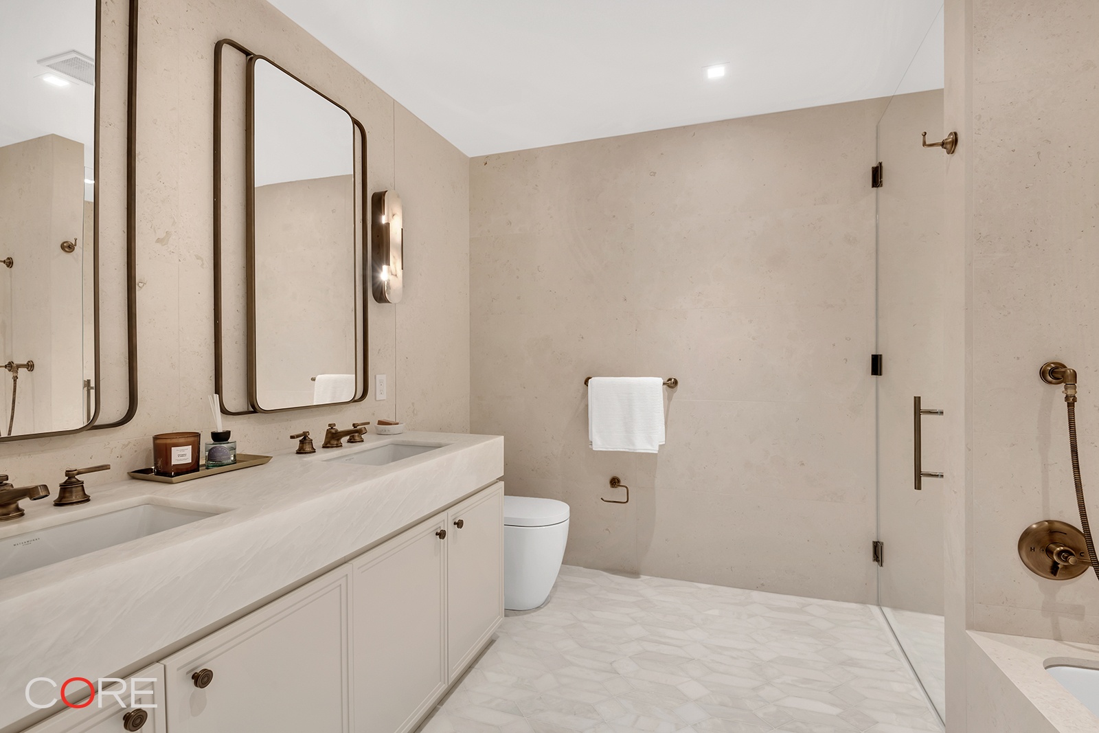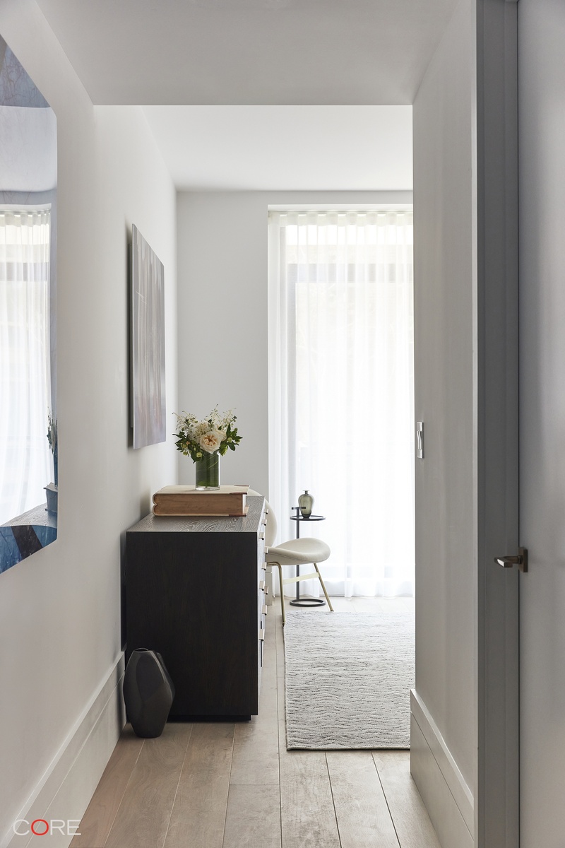 Separated in its own private wing, the primary bedroom is positioned at the south end of the home and overlooks the quaint and charming gardens beneath. The primary bathroom is a sanctuary of refinement, enveloped in Crema Luna limestone complemented by Namibia white marble. Radiant heated floors and high-end plumbing fittings from WaterWorks elevate the luxurious experience. Additional features of this apartment include a separate powder room, white oak flooring, solid-core wood doors with Valli & Valli hardware, a side-by-side washer and dryer, and a high-efficiency central VRF system for heating and cooling.